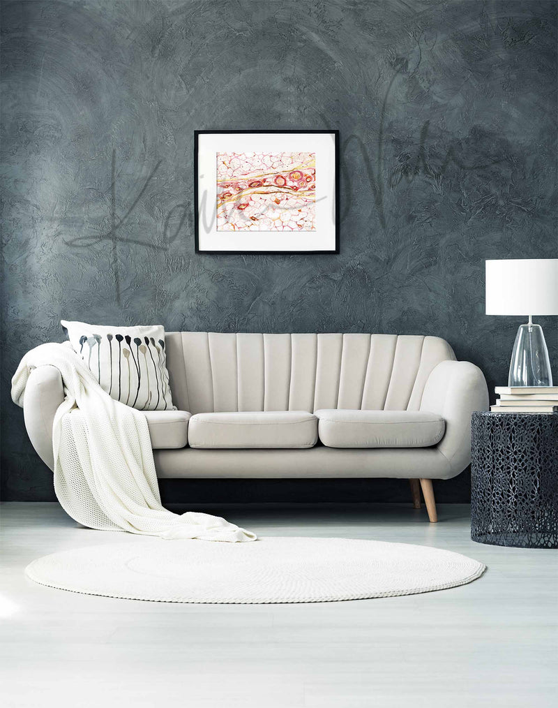 This is a print that I made of the Hypodermis, the deepest layer of skin. This piece is special because it is gilded with gold foil, adding an extra bit of shine to the watercolor. Because this is a print of the original piece, the gold will be visible, but it will not be metallic or have the luster of gold paint.