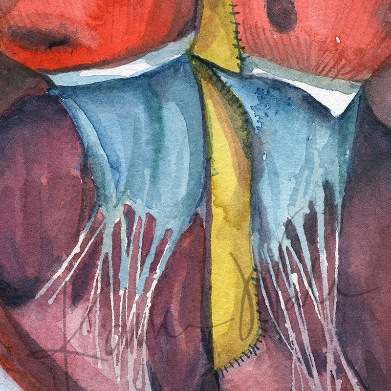 This is a print of a painting I made of the repaired atrioventricular septal defect with a common AV canal. AVSD is when there are holes between the chambers of the right and left sides of the heart.