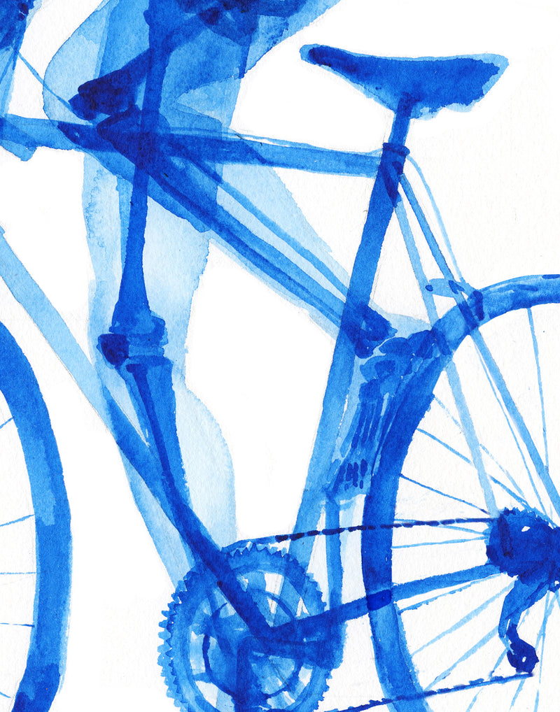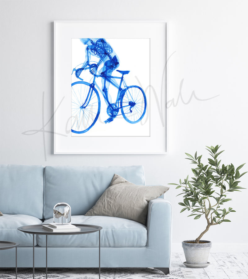 This is a bold and bright print of a blue watercolor painting I made of the skeletal anatomy of a biker. This one was a long time coming—my mom and dad are avid cyclists and I've been hoping for years to paint one for them. It is the perfect print for any cyclist, triathlete, sports medicine doc, physical therapist or sports enthusiast! It also pairs well with my muscular anatomy biker painting.