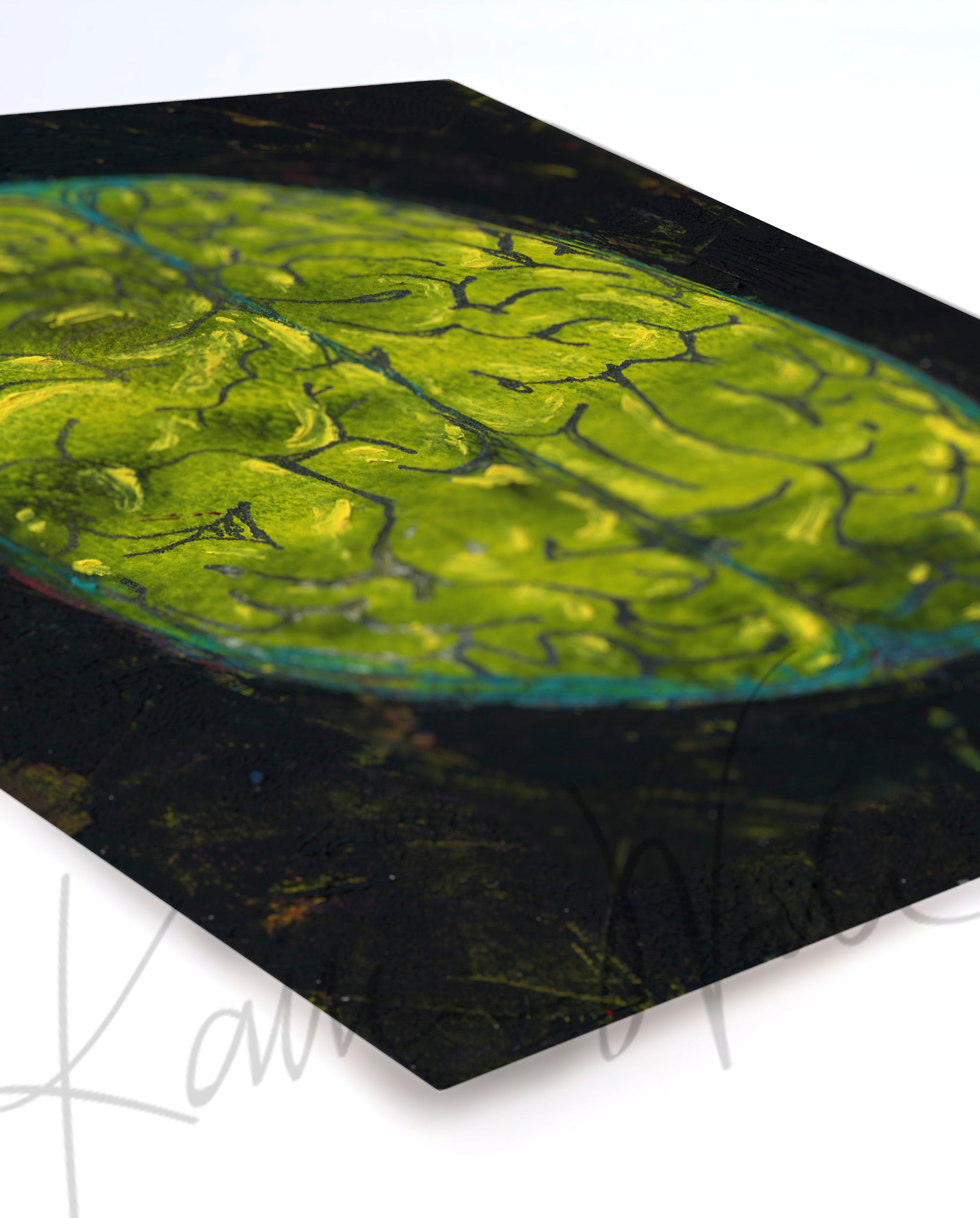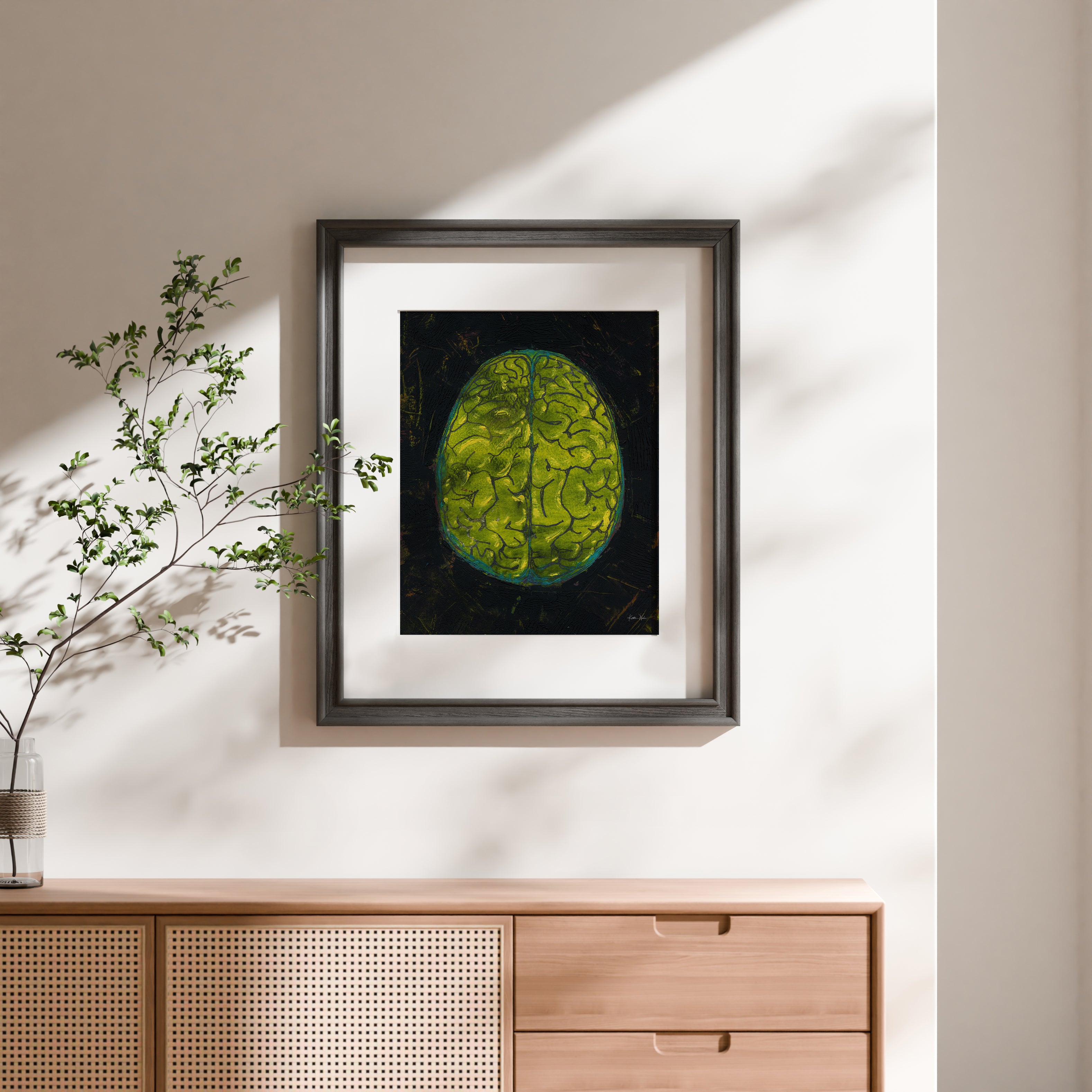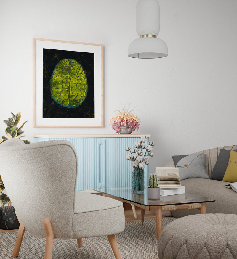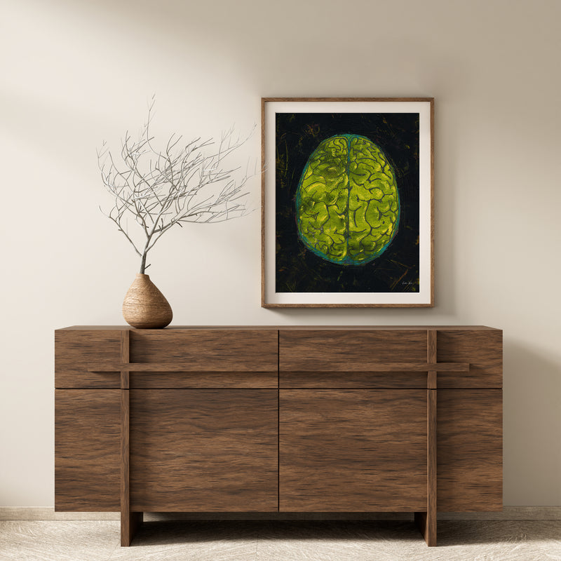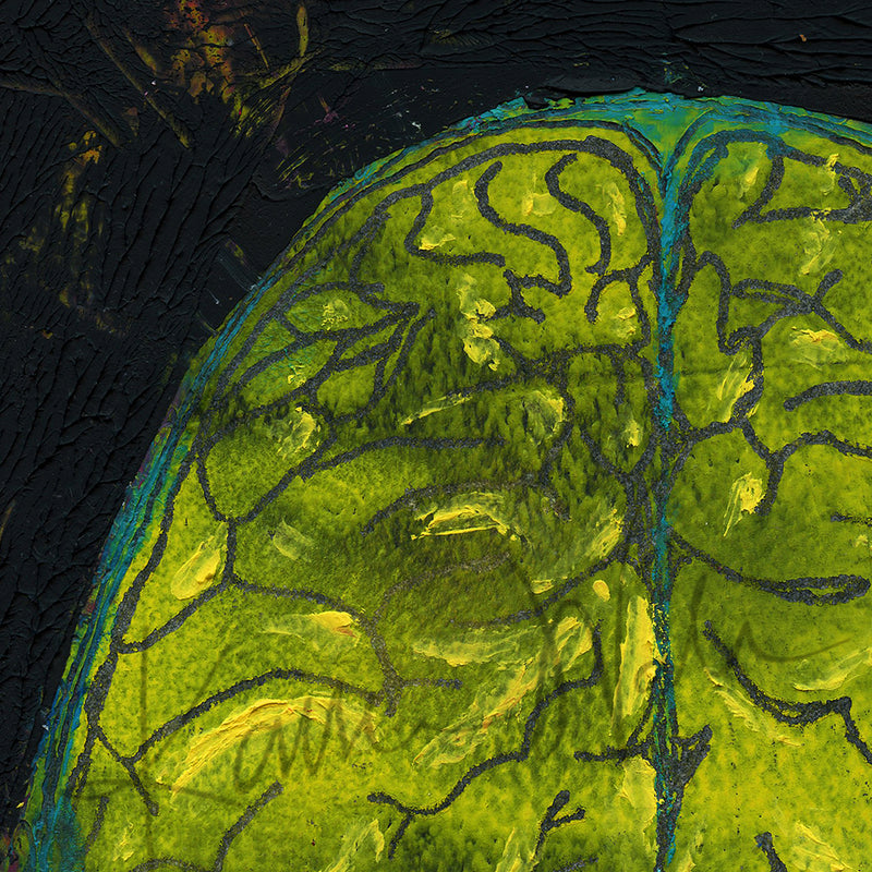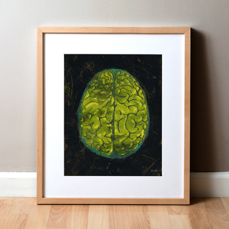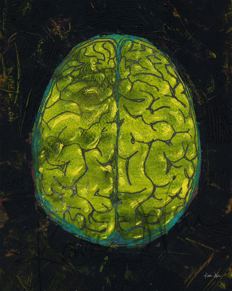 This is a print of an original oil and cold wax painting I created. It showcases a top-down view of the brain in bold black and yellow colors, with a hints of turquoise and magenta. Its textured feel, bold layout and vibrant palette provides a happy retro eighties vibe.