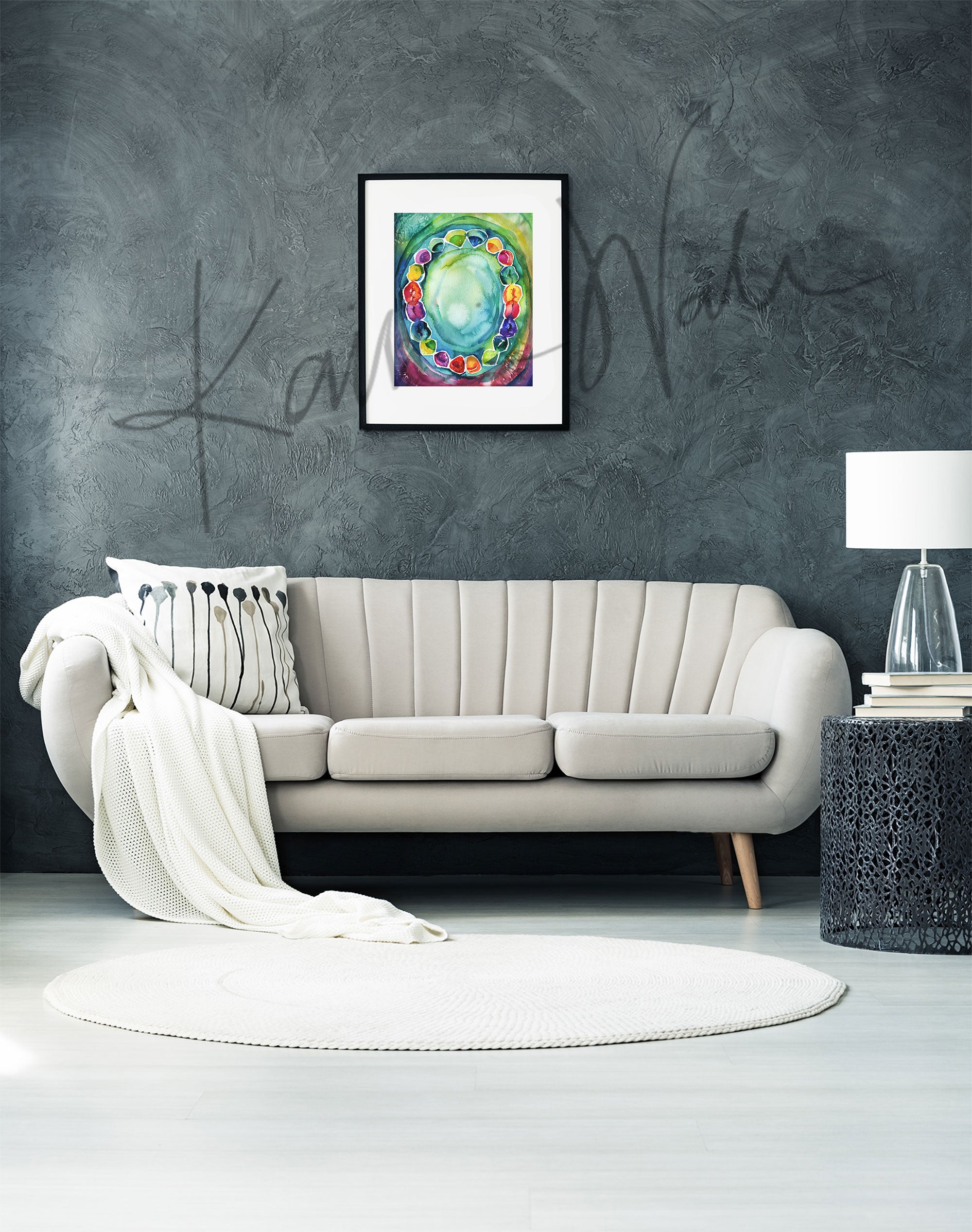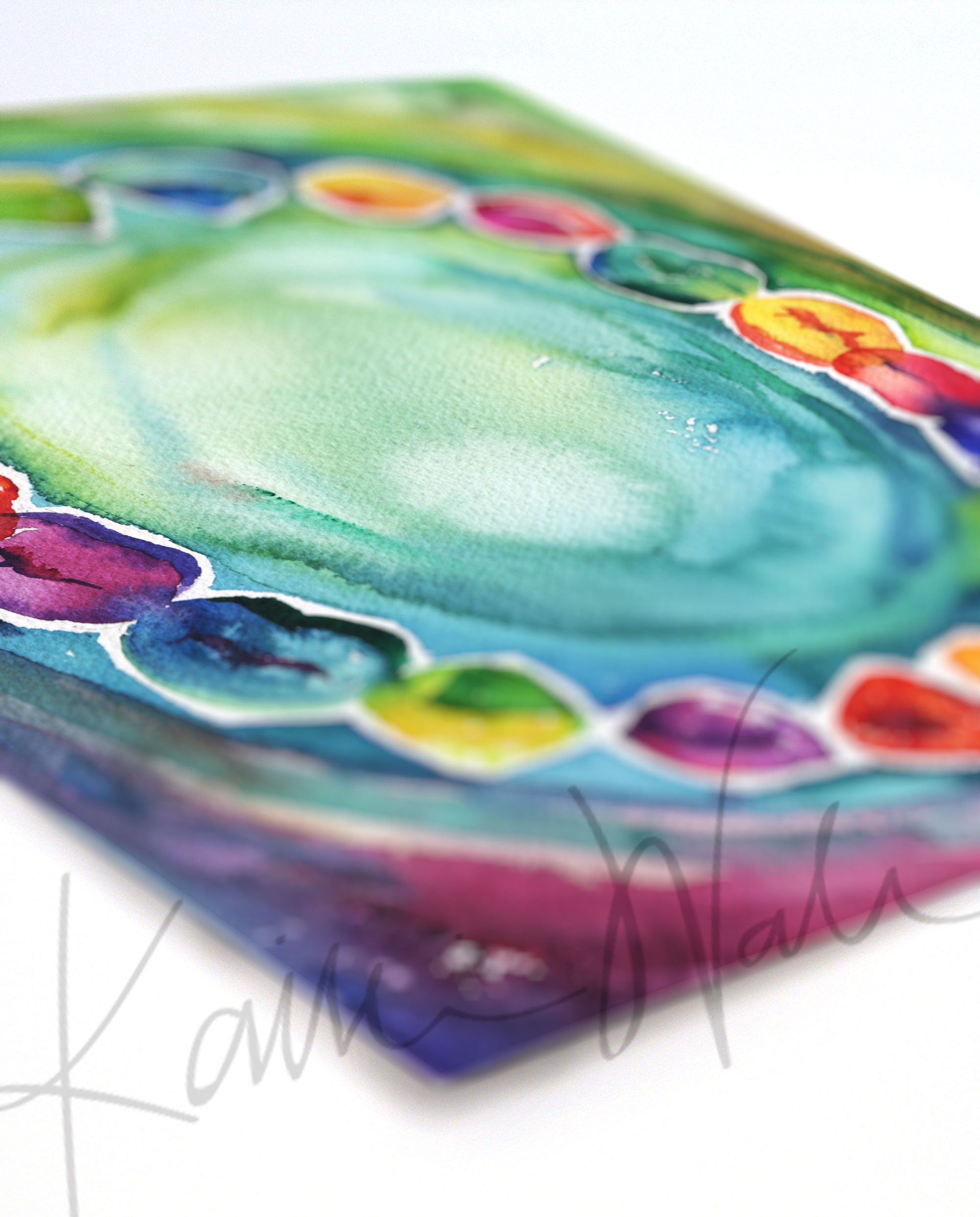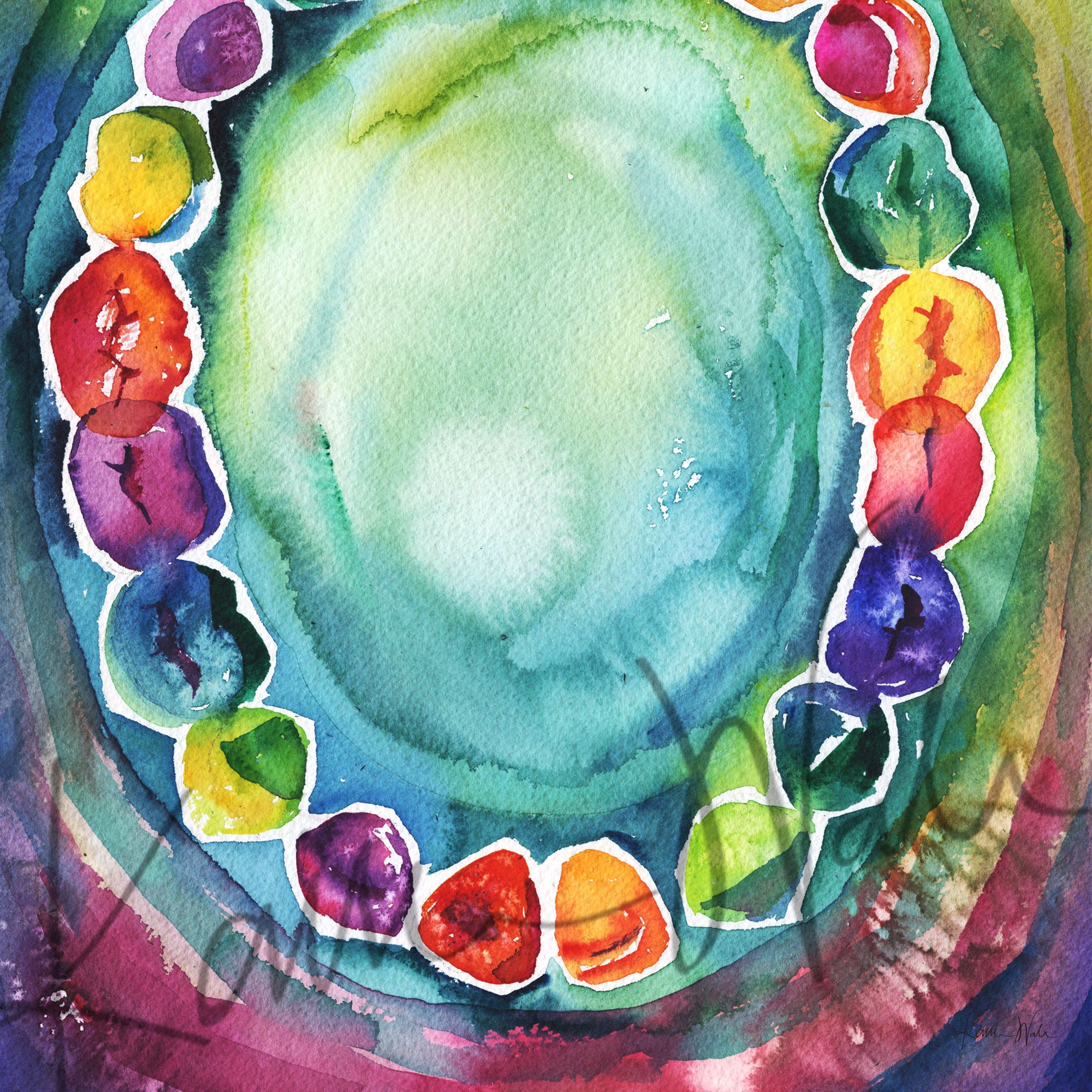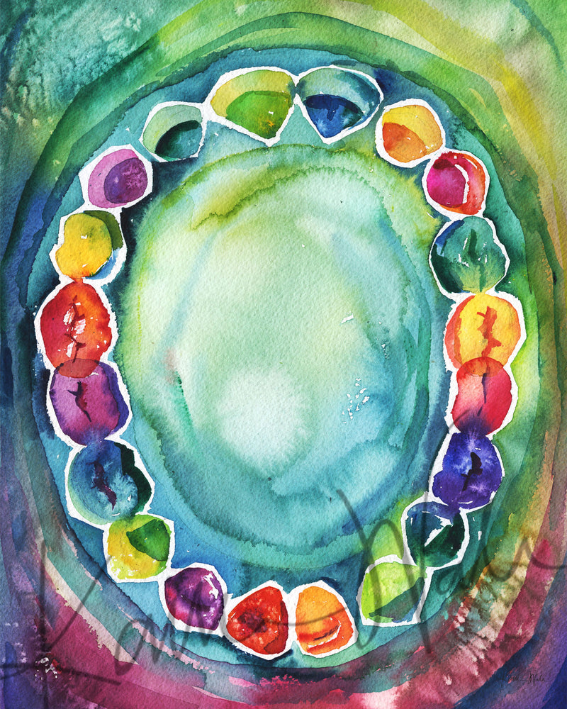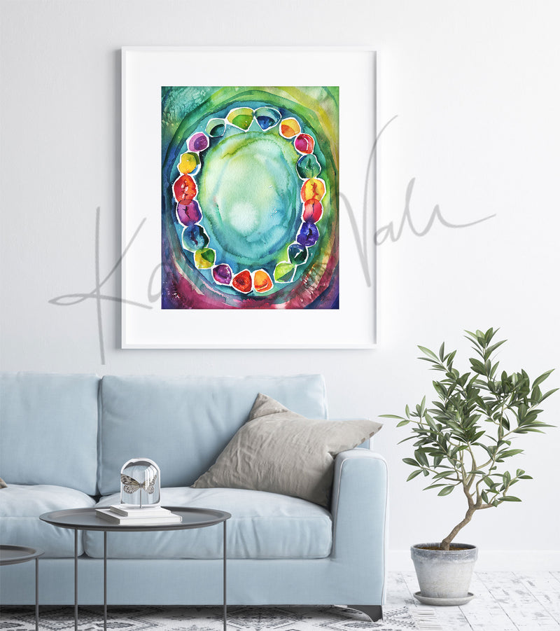 This painting is a fun and abstract watercolor of the baby teeth we lose as we grow. The bright and colorful palette is perfect for any dentist office!