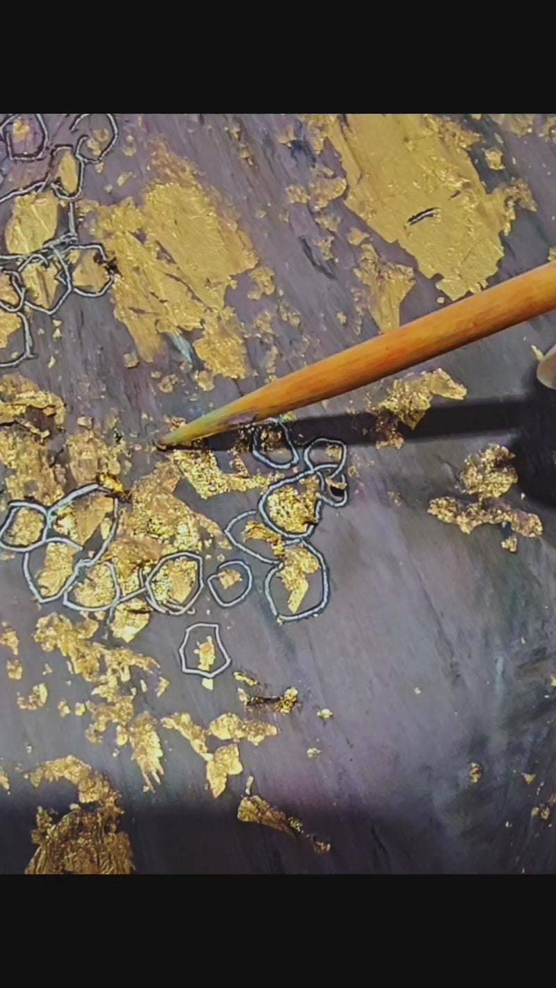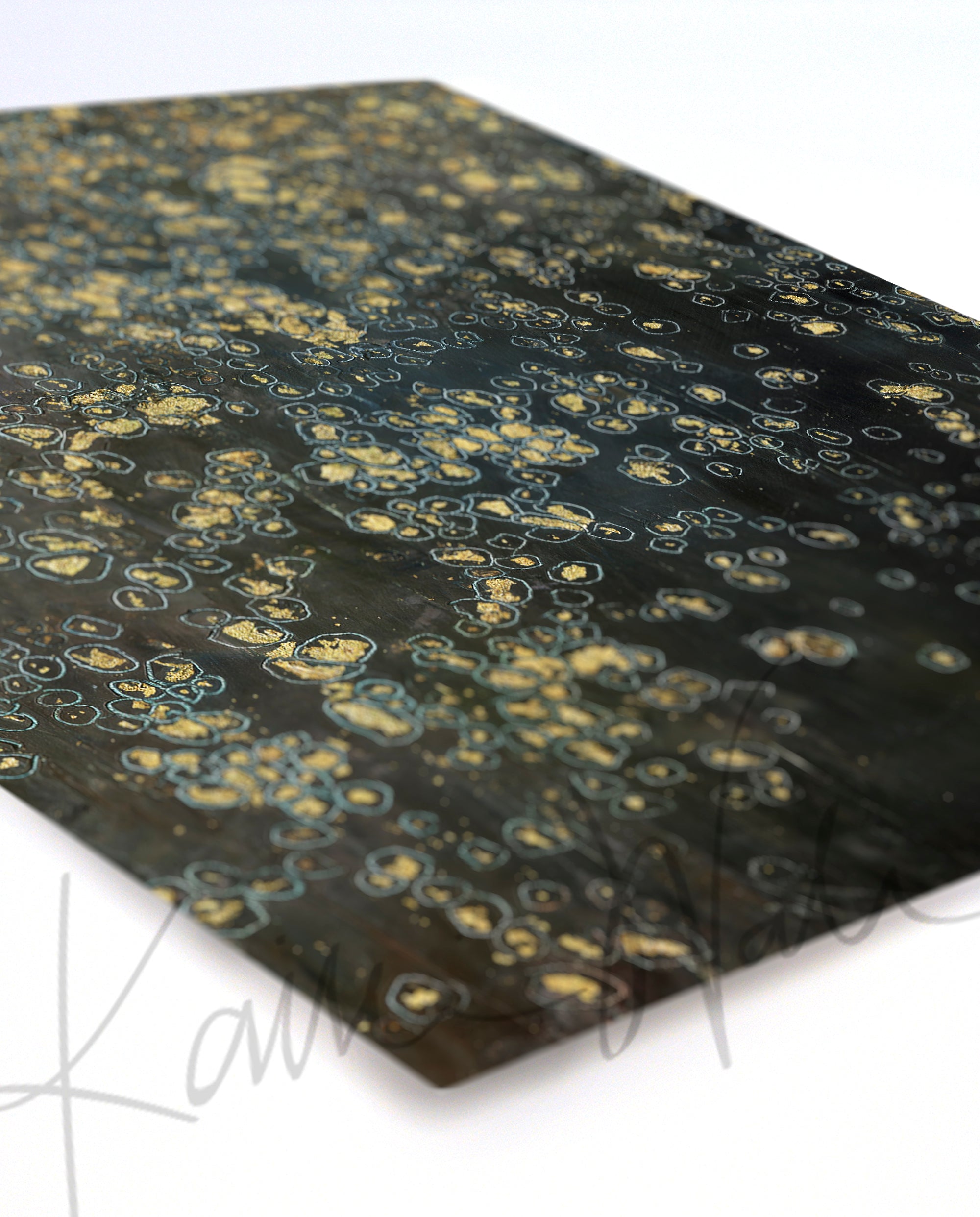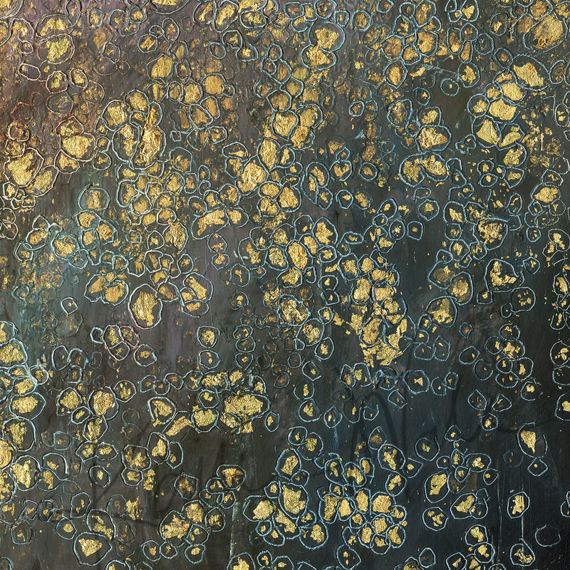 This is a print of an original piece of cells I made with cold wax and gold foil. This piece is an abstract representation of cells in regular tissue, with the gold representing the nuclei. Because this is a print of the original piece, the gold will be visible, but it will not be metallic or have the luster of gold paint.