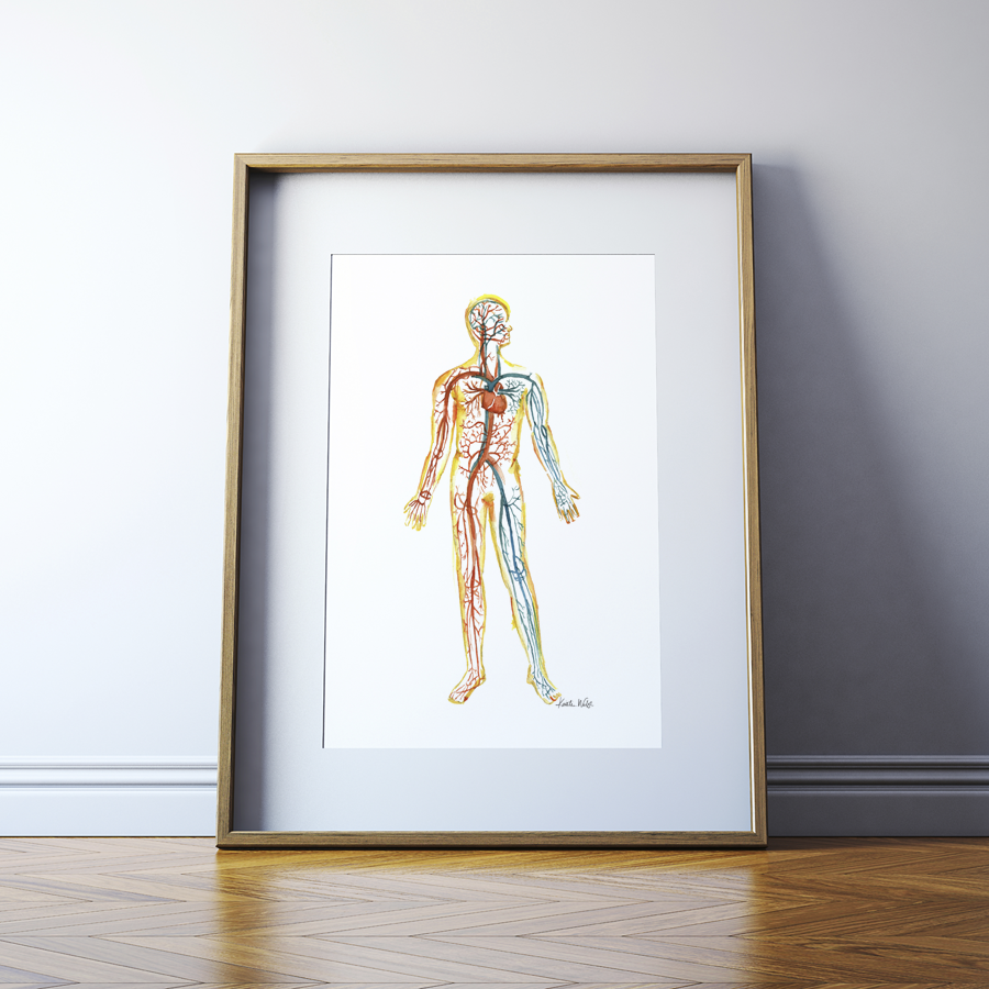 This is an anatomy art print of a watercolor painting that I made of the circulatory system. I especially like the stance of the circulatory man! An ideal art print for any medical professional, especially those working in vascular anatomy!