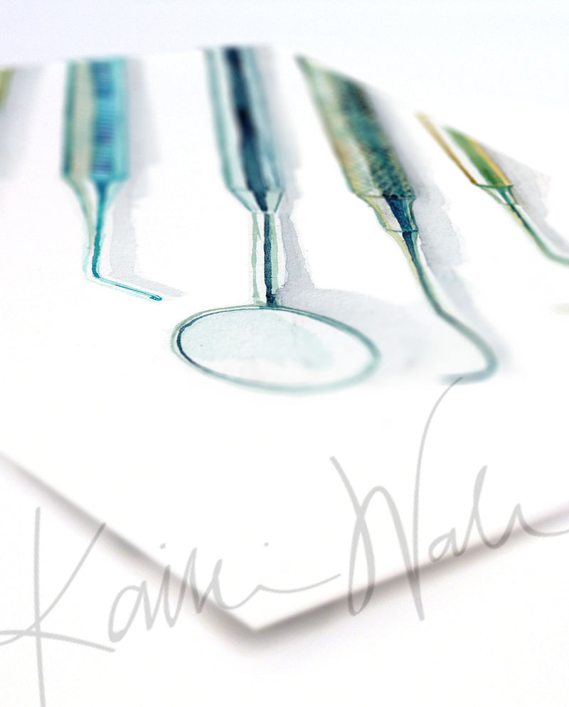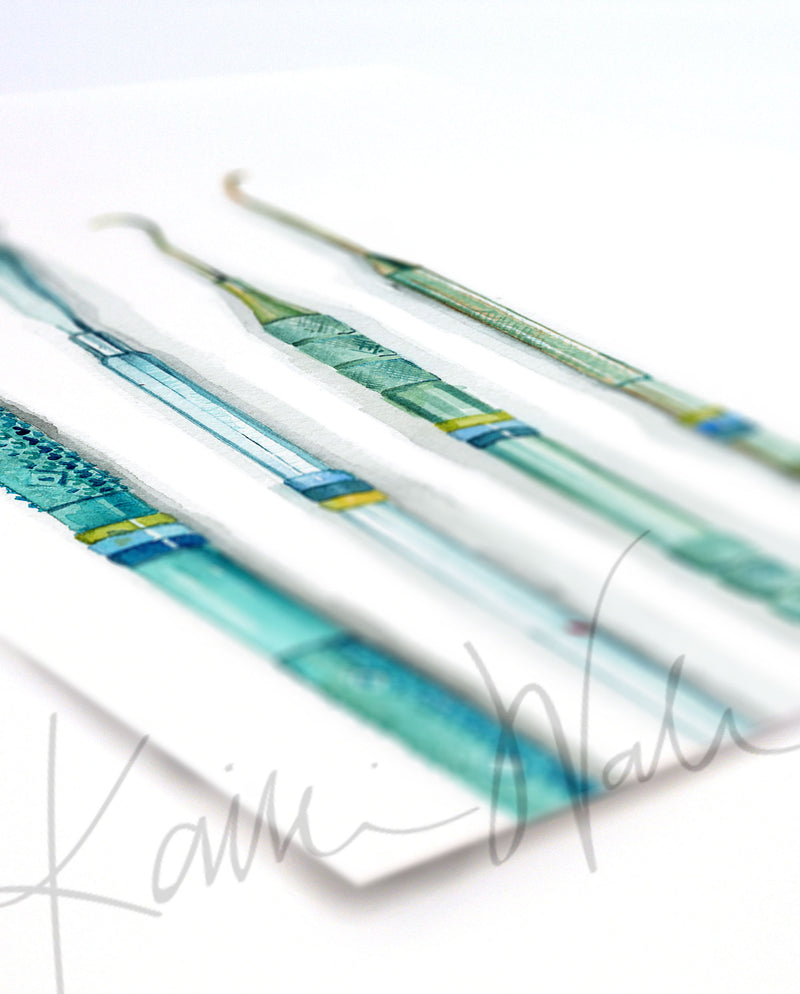These intricate watercolor prints show dental hygienist tools. They were commissioned by a dentist to hang in their office in the room where hygienist work. I used colors to match other dental paintings I’ve done. It was fun to work on all the details to provide the texture you can almost feel by looking at it. I hope you love these as much as we do!