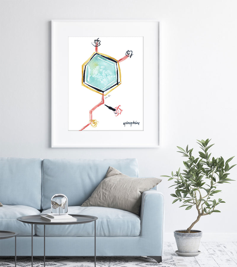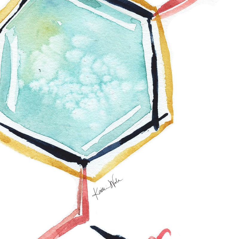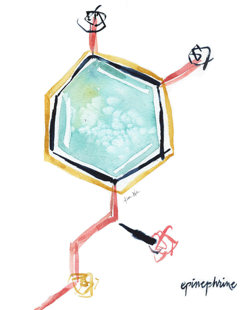 This watercolor hormone print depicts the Epinephrine structure. Released by the adrenal gland when excitement, fear or anger is present, Epinephrine, also known as Adrenaline in the bloodstream causes an increase in heart rate, blood pressure, and muscle strength. Did you know Epinephrine is what is given to treat severe allergic reactions, cardiac arrest, and severe asthma attacks?