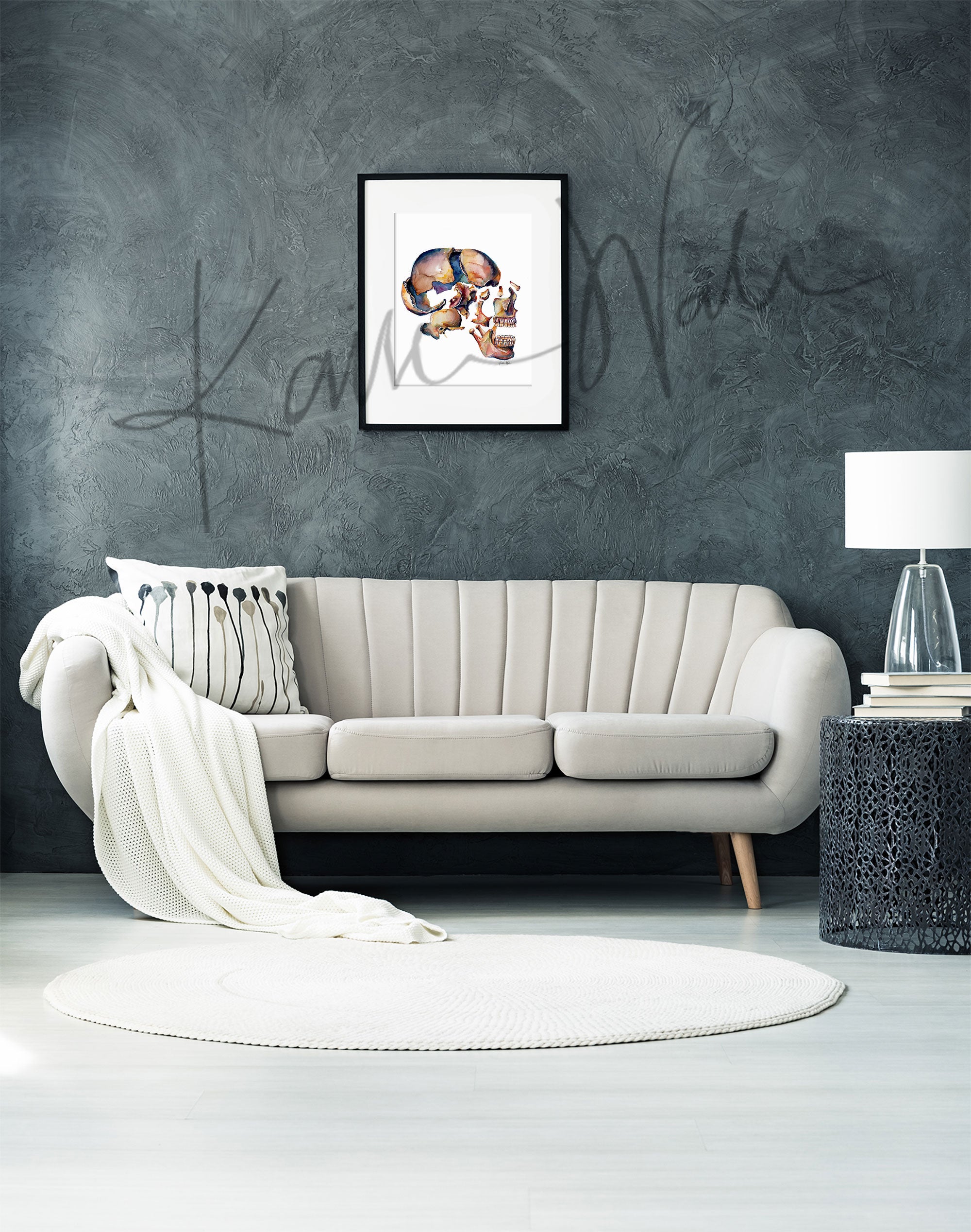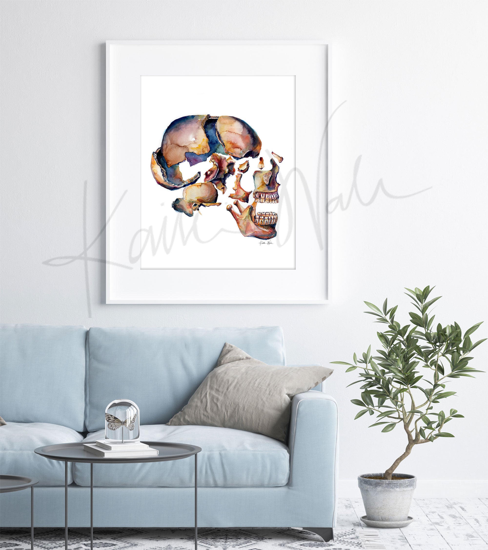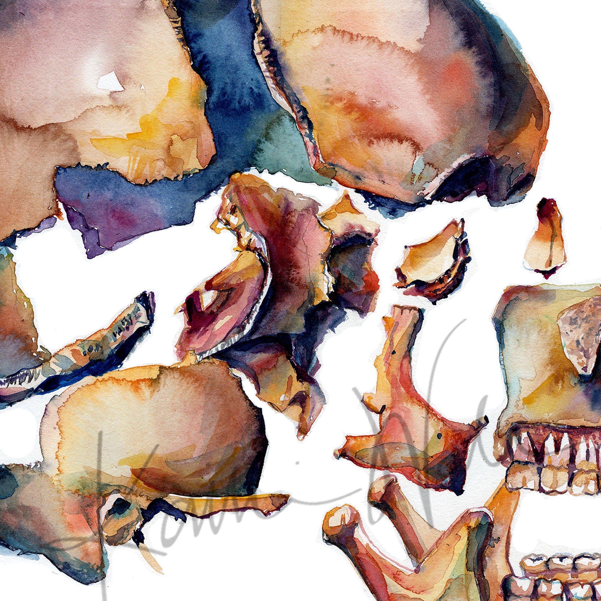 This second rendition of a disarticulated skull is a side view and has also quickly become a favorite! It shows the bones in the human skull that you can see from the side. I love how the color scheme makes it realistic enough to hang in a medical office but abstract enough to make it perfect for hanging in the home.