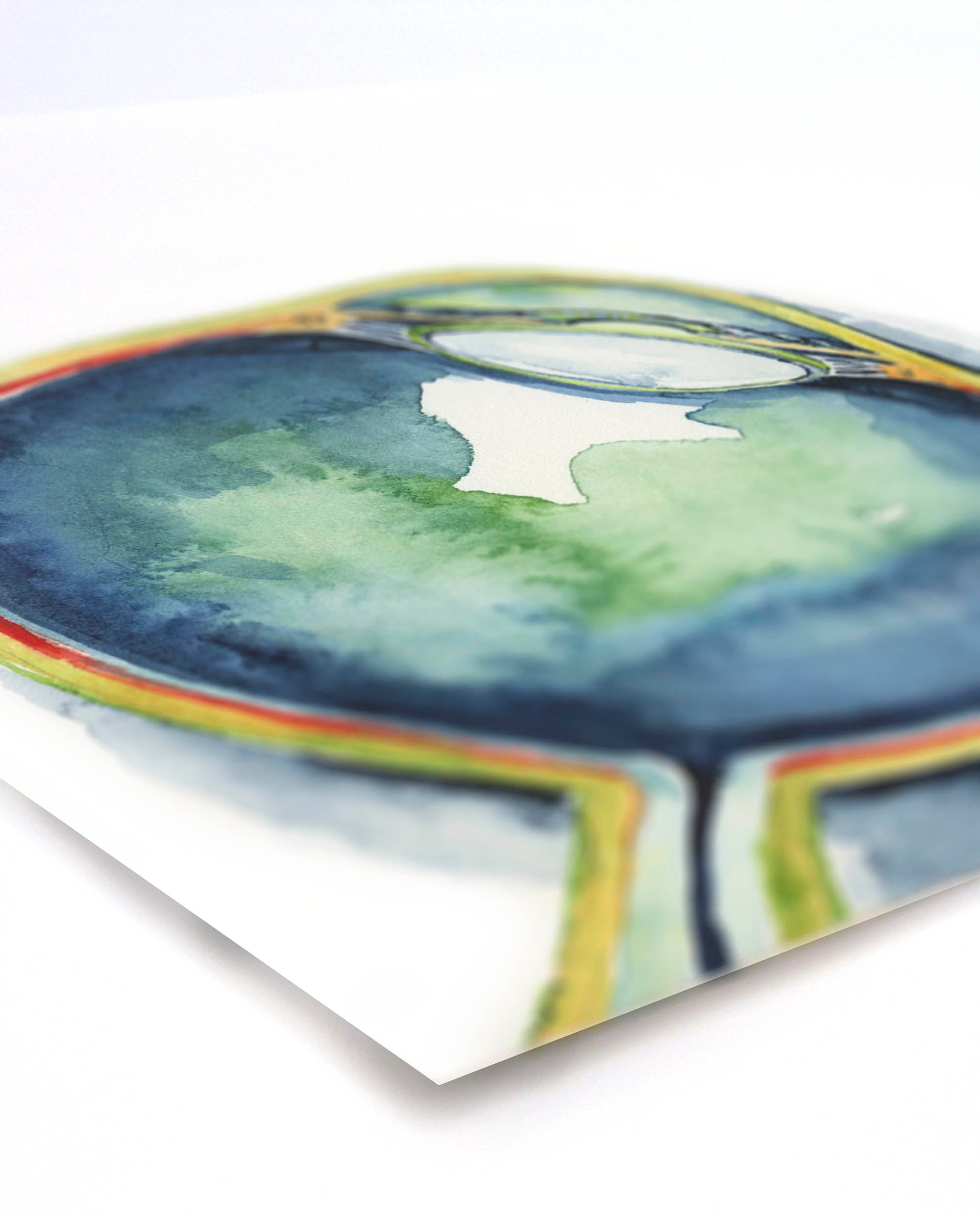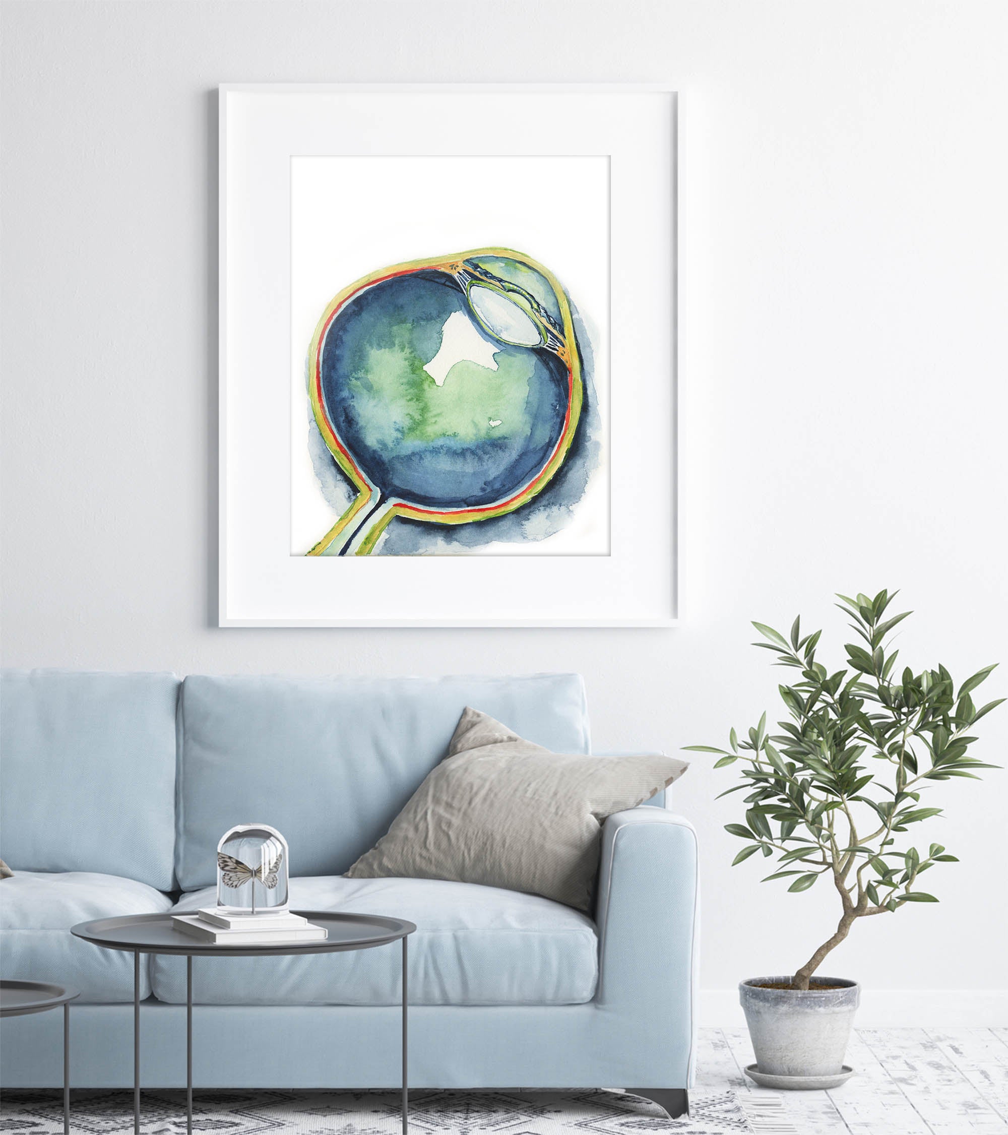 This is a print of an original watercolor I created of the eye in teals, yellows, and oranges. This painting depicts the eye as a key element in visual processing and tracking, connecting eye, mind, and body together.