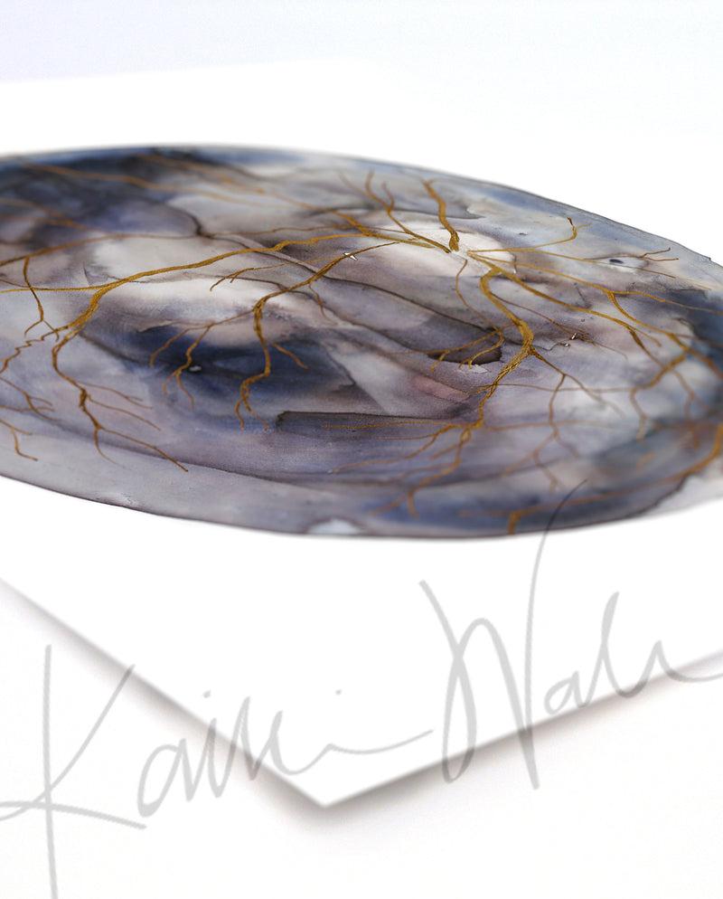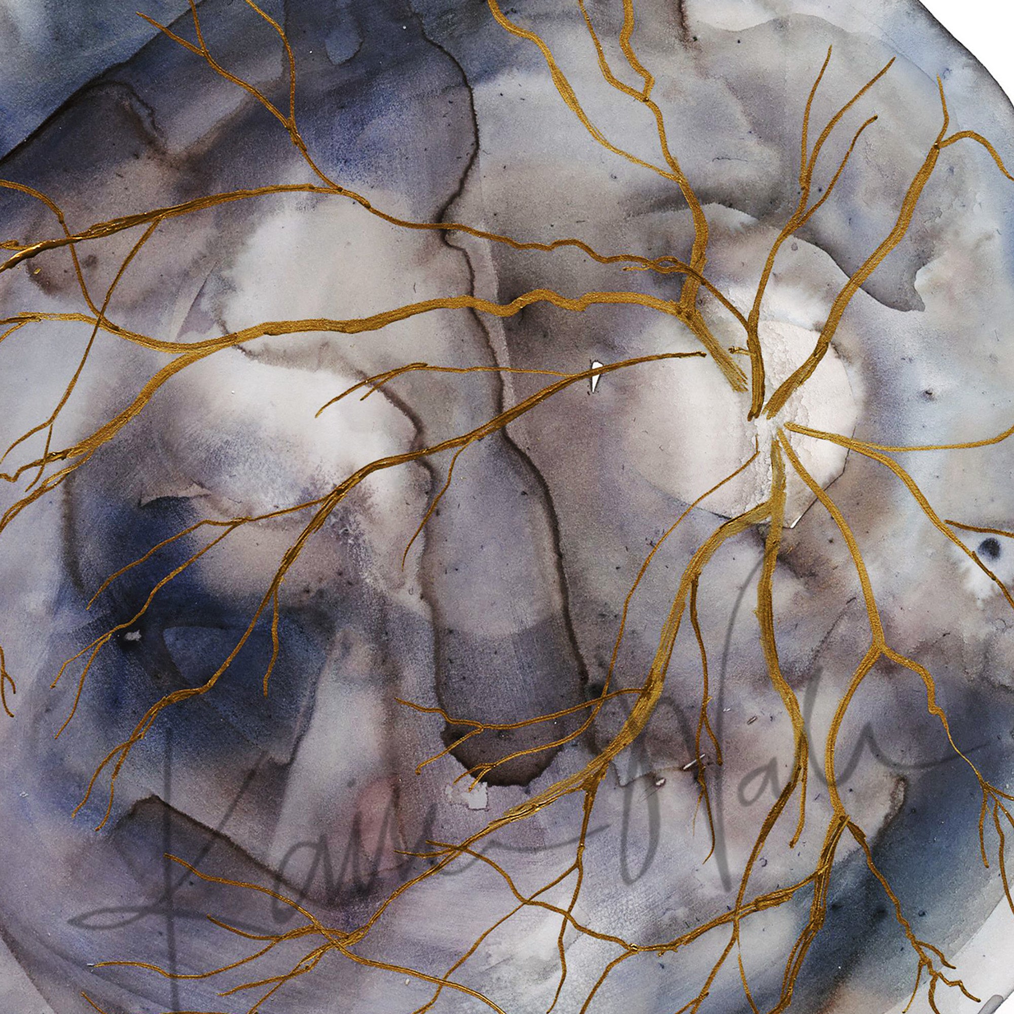 This is a print I made of a retina in grays and golds! This is a part of a retina set that is dear to my heart, since I painted them with my dad, who used to be an optometrist. Because this is a print of the original piece, the gold will be visible, but it will not be metallic or have the luster of gold paint.