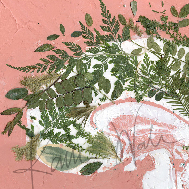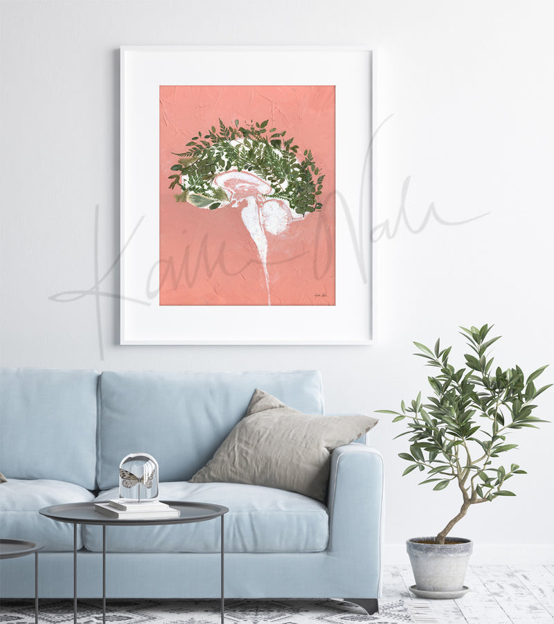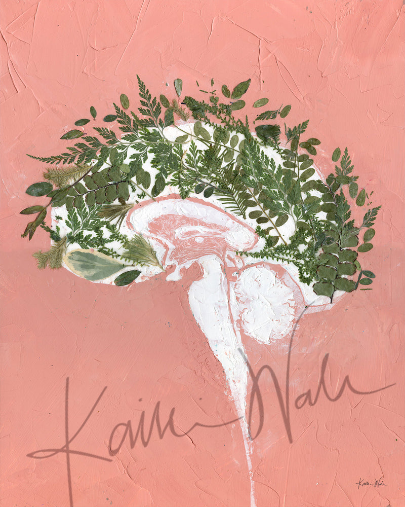 This is a print of a painting I made using oil paint, cold wax and pressed leaves. This anatomy art showcases a sagittal view of the brain and brain stem anatomy and is called "Grow".