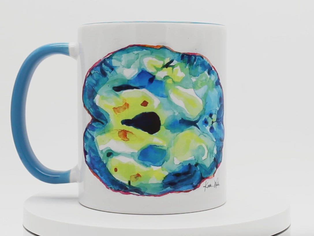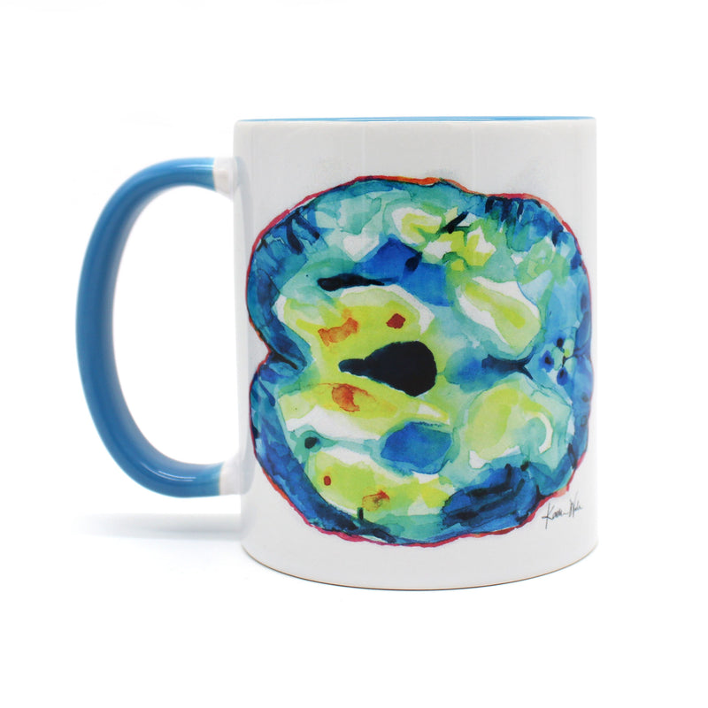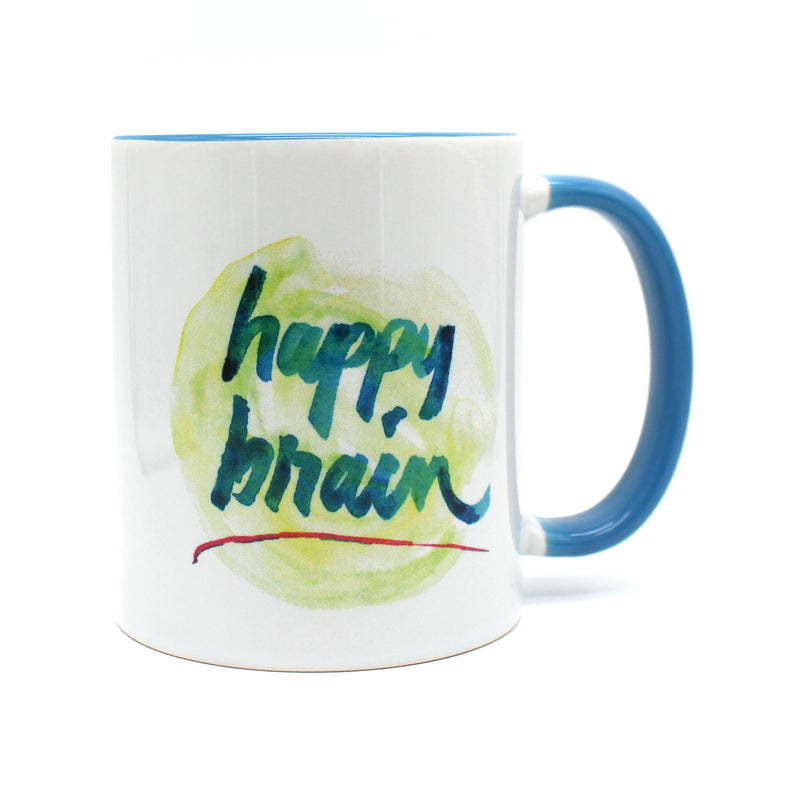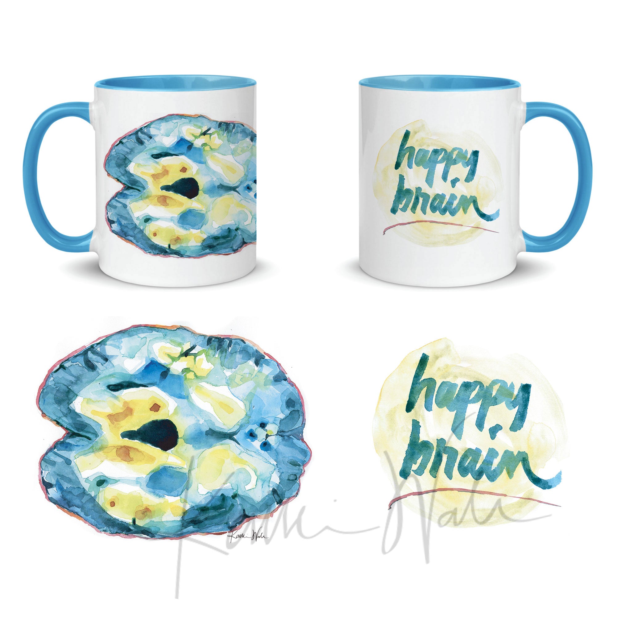 This smile inducing Happy Brain coffee mug was created using my happy brain watercolor print. I was inspired by a PET scan of a brain showing beautiful, bright activity!