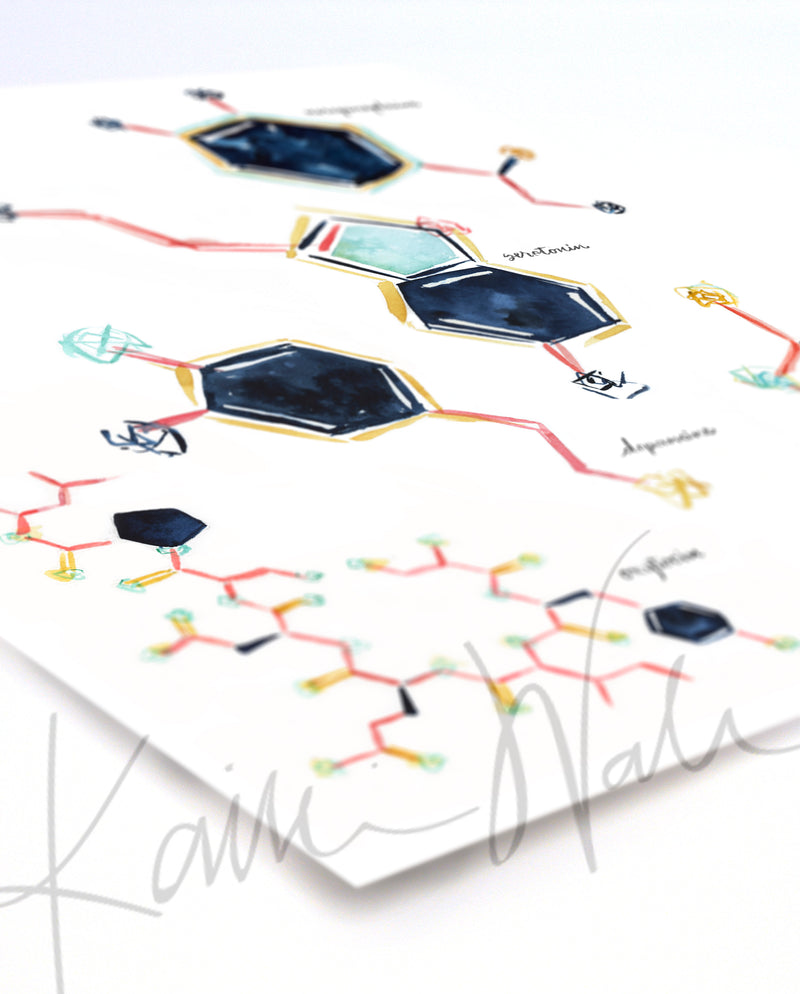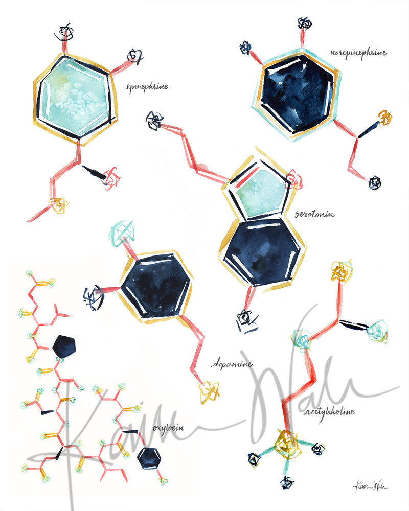 This is a poster of seven neurotransmitters, or as I like to think of them, Happy Hormones! These powerful hormones each fill an important role of regulating your body, kicking it into gear, or filling you with pleasure and satisfaction!