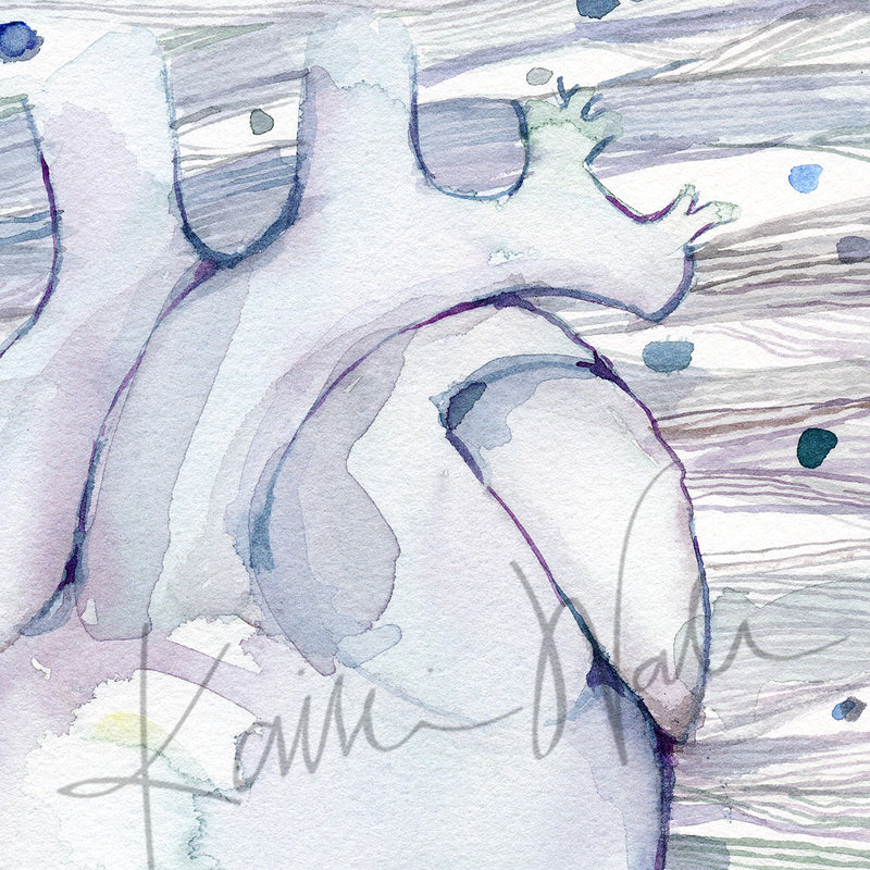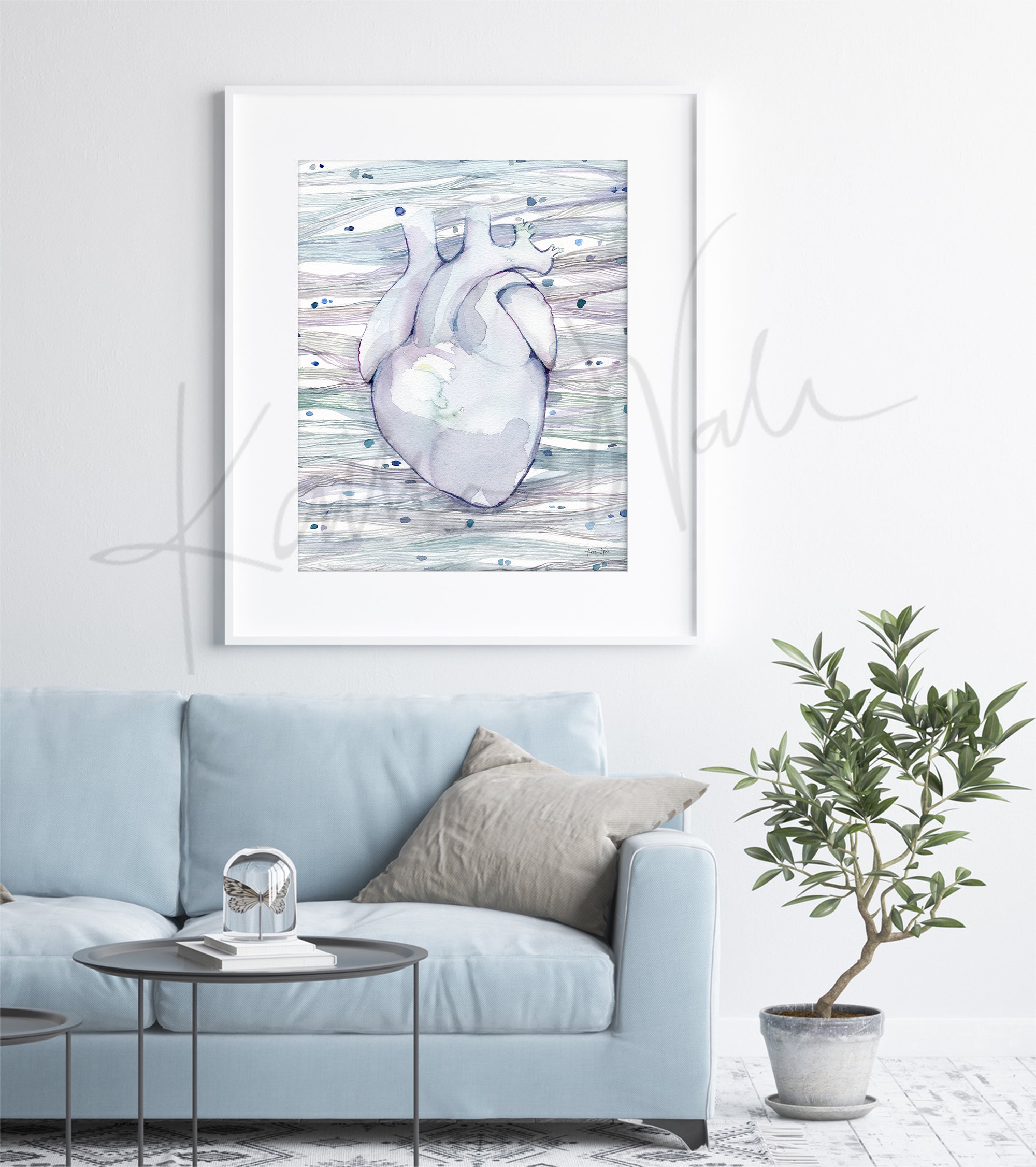 This is a print of watercolor painting I made. It is part of my series, “Cell Patterns,” where the patterned background is created using organ cells. This one depicts myocardiocytes, the pulsing cells that make up the heart.