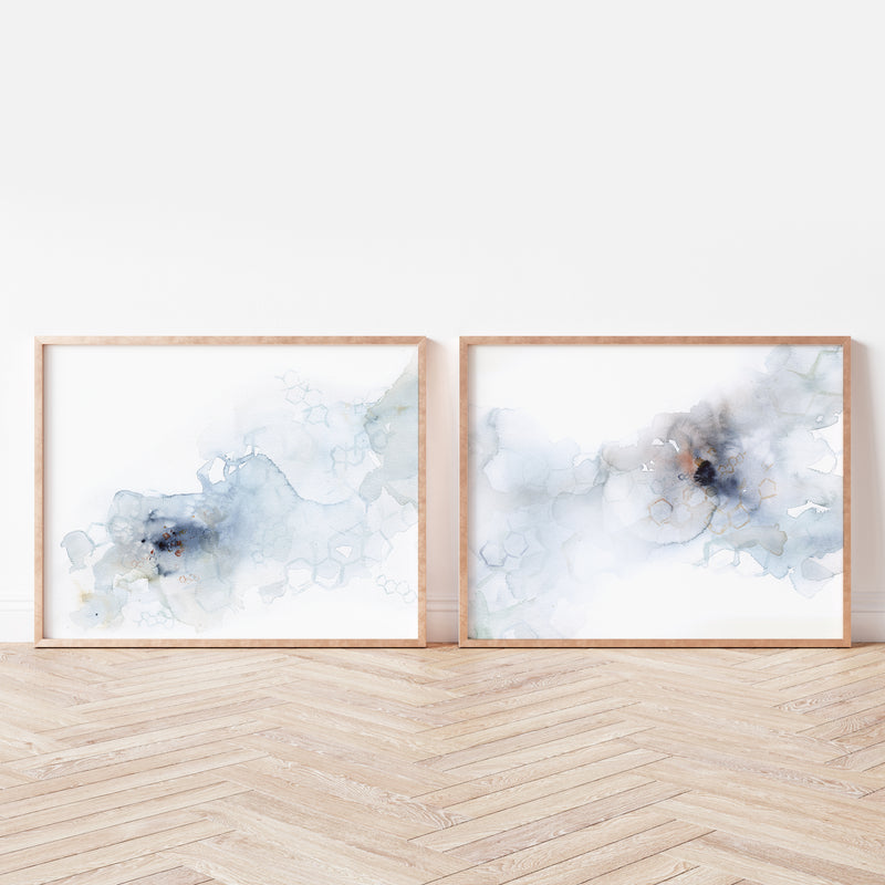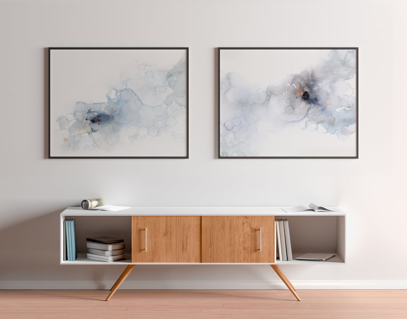 These are prints of two watercolor paintings I made. They are a very abstract depiction of hormones, specifically estrogen, progesterone and testosterone. The commissioner liked the idea of showcasing these hormones as they gently flowed through the blood. It's perfect art for a medspa or any medical clinic, as you'll know it's biochemistry, but your patients won't!