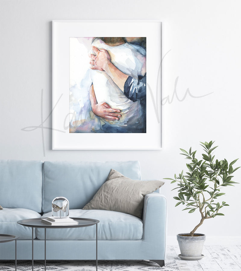 This watercolor painting was commissioned for an OBGYN consultation room where from new pregnancy consultation to pregnancy loss or breast cancer, a hug is always a welcomed gesture. Who doesn’t want a “congratulations” or “we’re going to get through this” hug?!