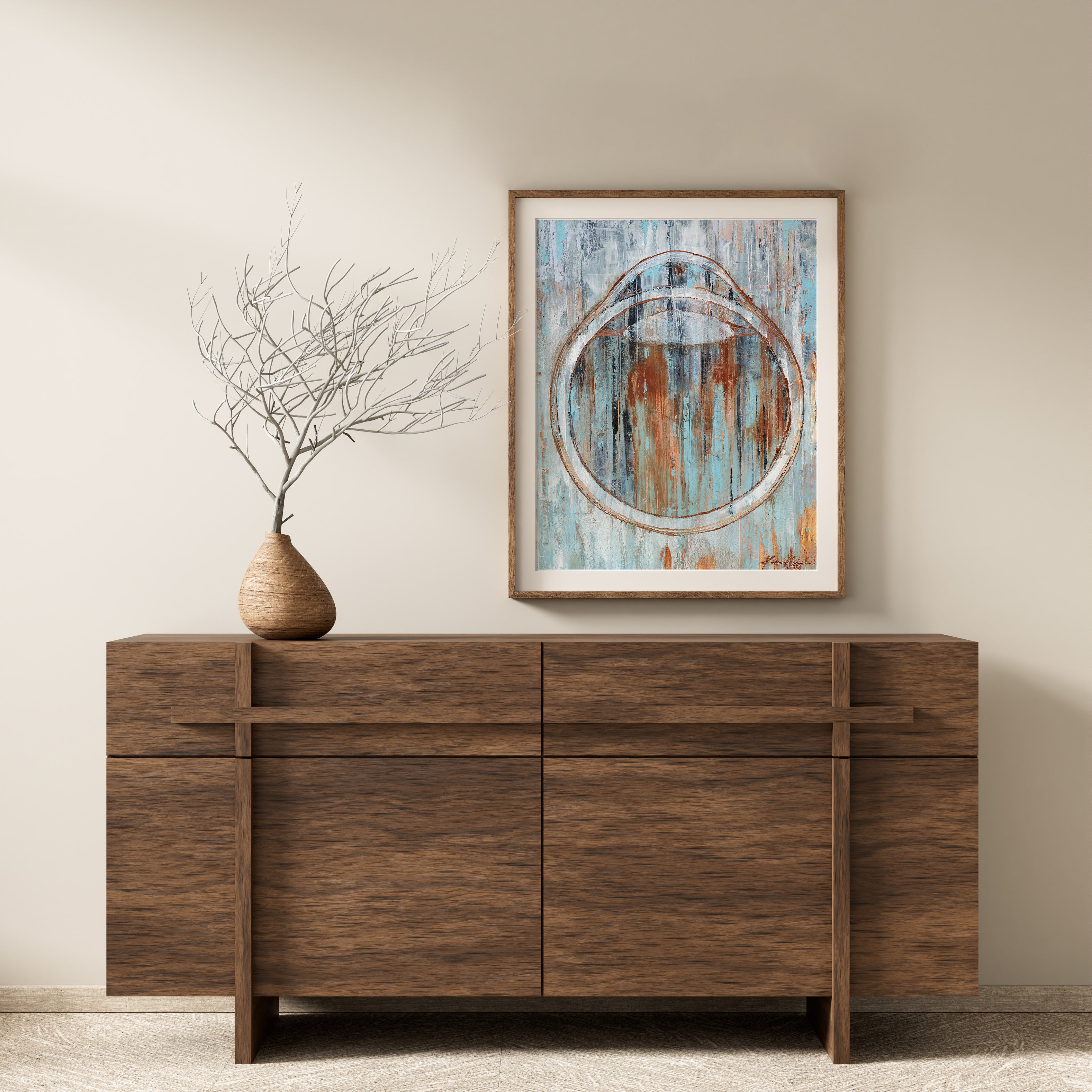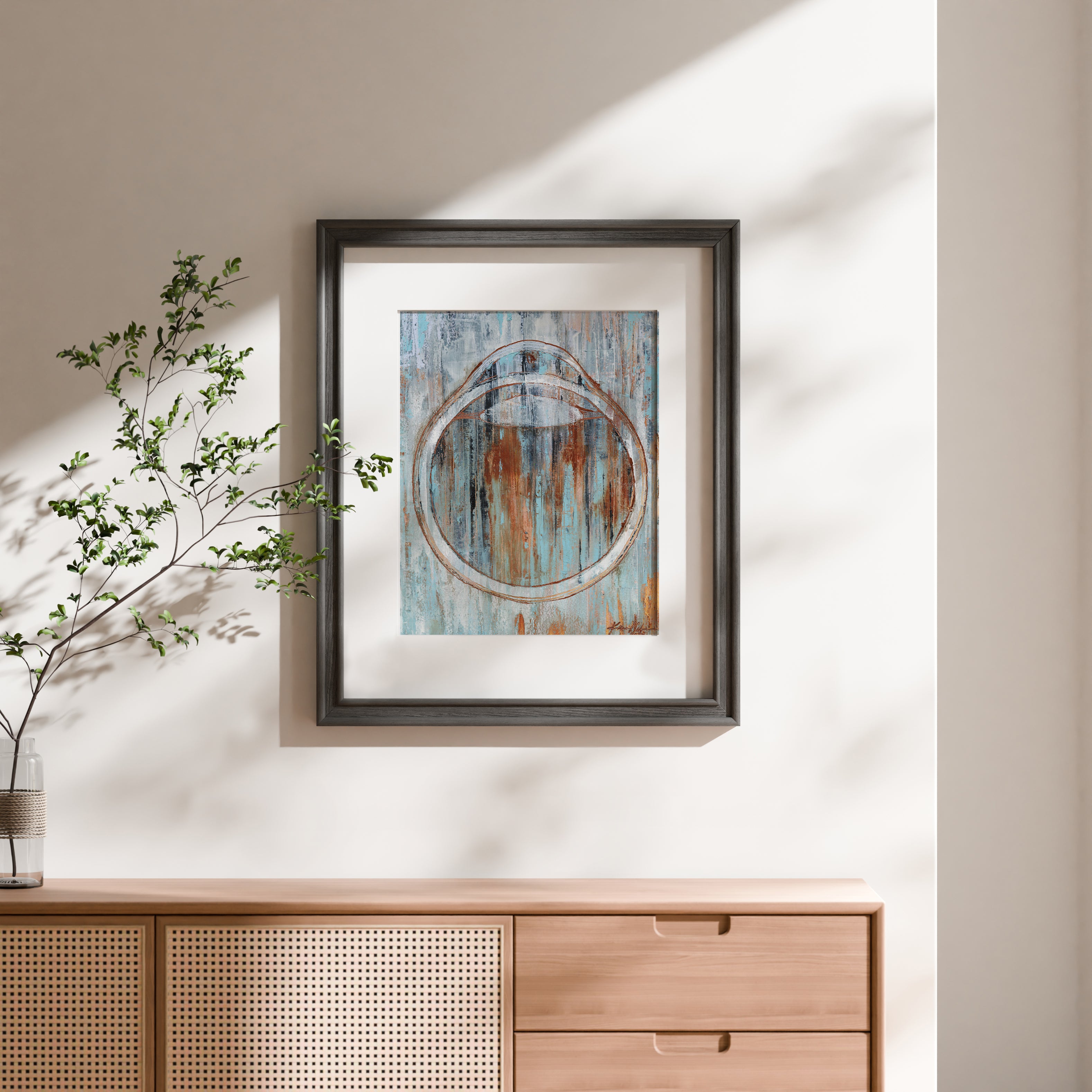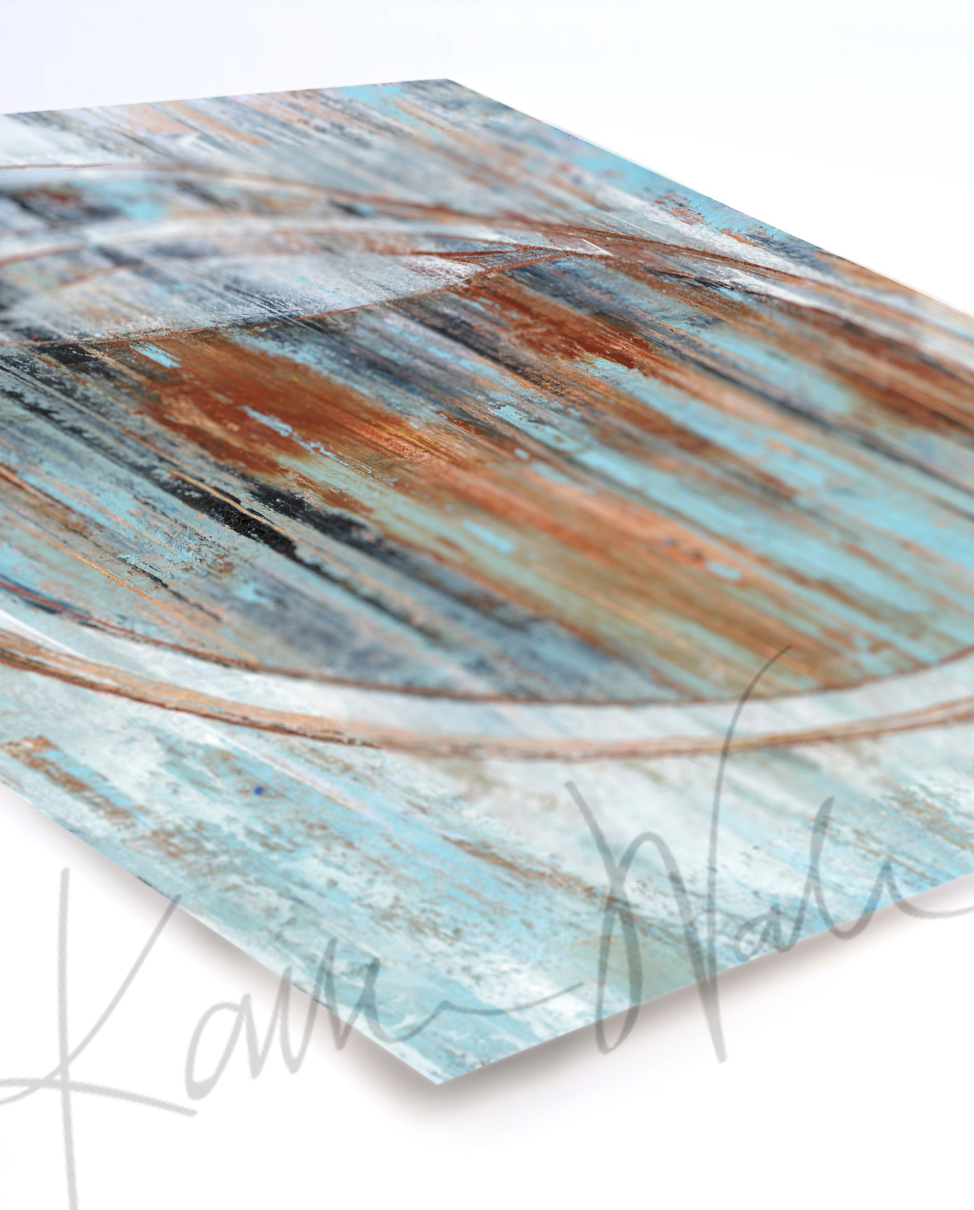 This is a print of an original eye anatomy painting I made out of oil paint and cold wax. The patterning and color palette in gray, white, brown and sky blue strongly reminds me of a birch tree forest. This explains to why I entitled it, “In My Mind’s Eye, for I’m a girl who loves the Wisconsin Northwoods and I find peace and joy when I keep such scenery in my mind’s eye. The anatomy of the painting showcases the cornea, lens, vitreous chamber and retina.
