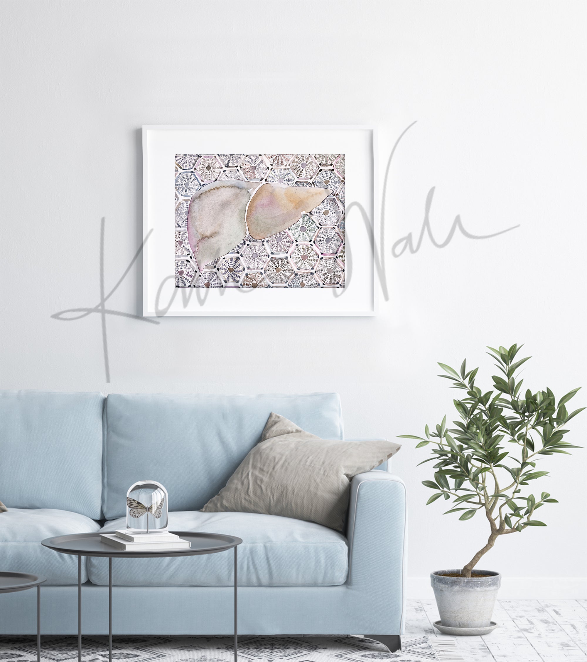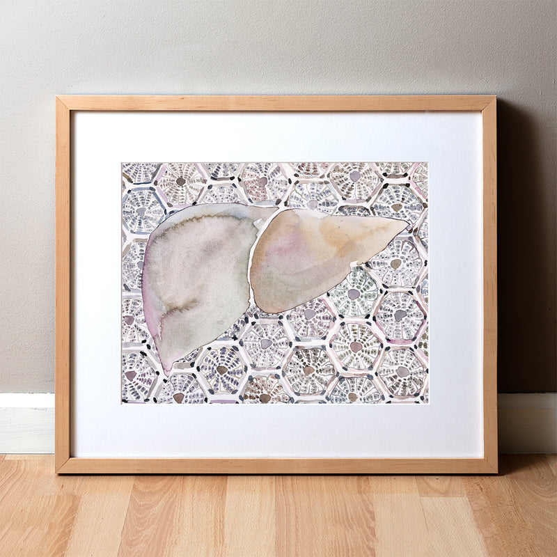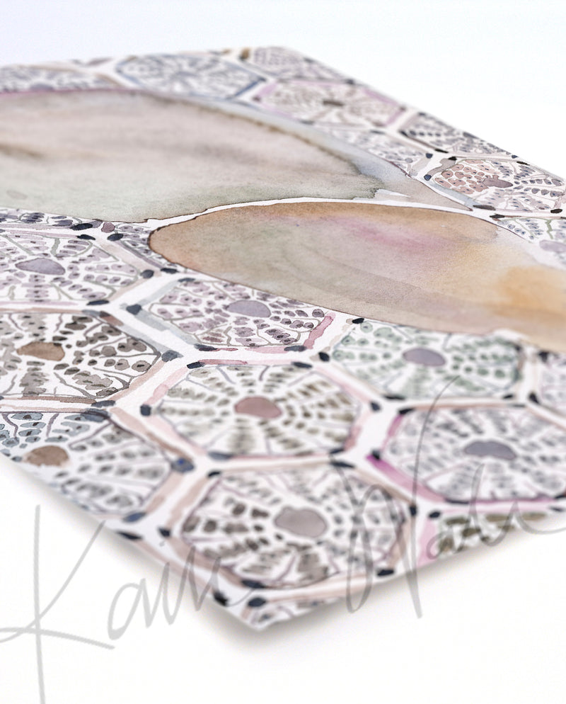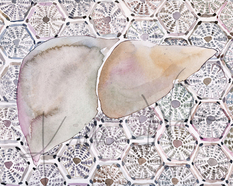 This is a print of watercolor painting I made. It is part of my series, “Cell Patterns,” where the patterned background is created using organ cells. This one depicts hepatocytes, the hexagonal cellular units that are the workhorse of the liver.