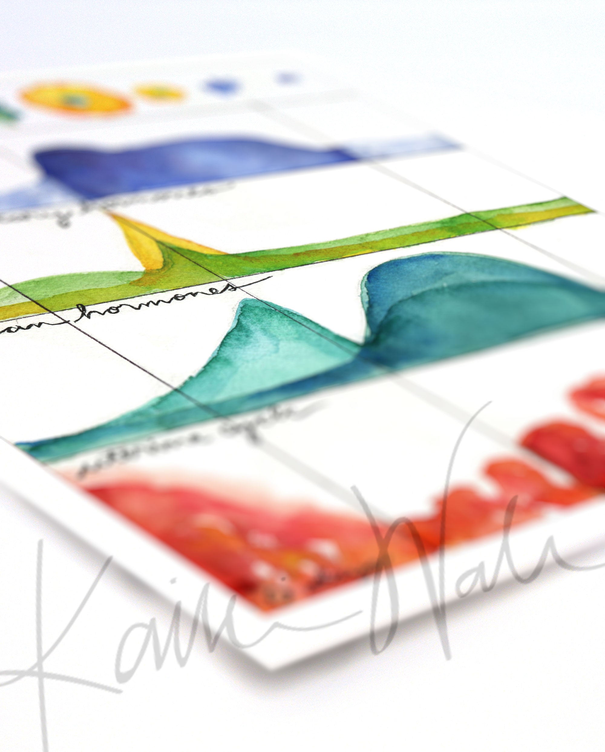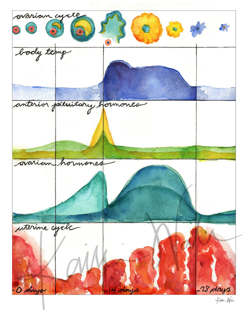 This beautiful and colorful watercolor print depicts the stages of the menstrual cycle. The watercolor, flowing style makes it a great art piece but also a stunning, visual, informative tool for doctors to use with their patients!