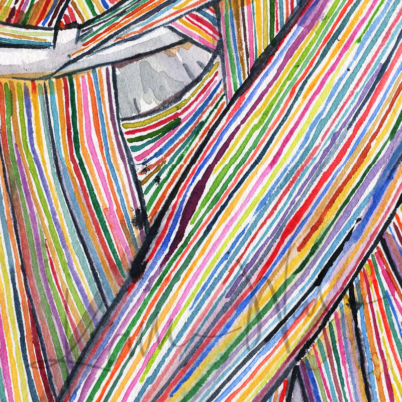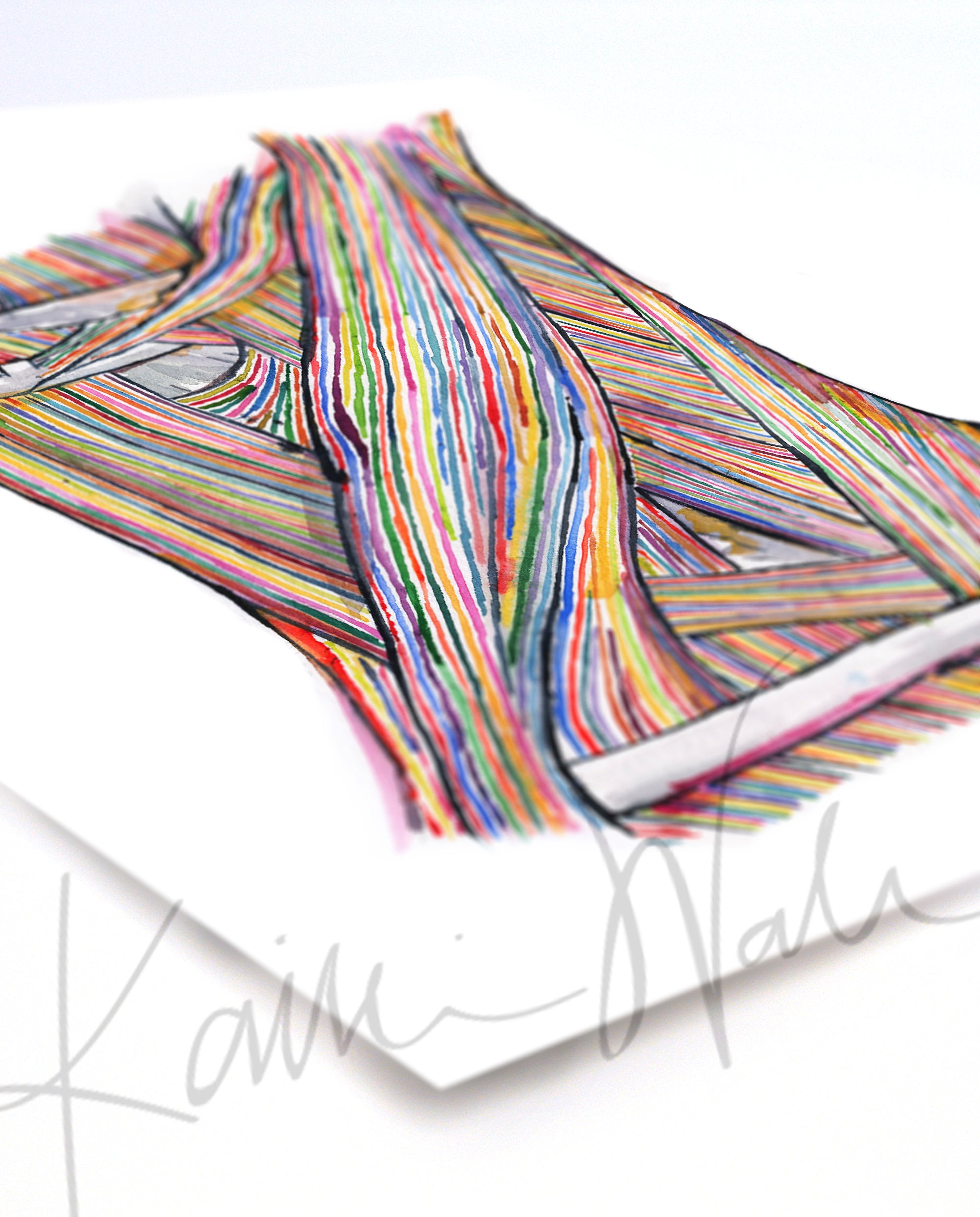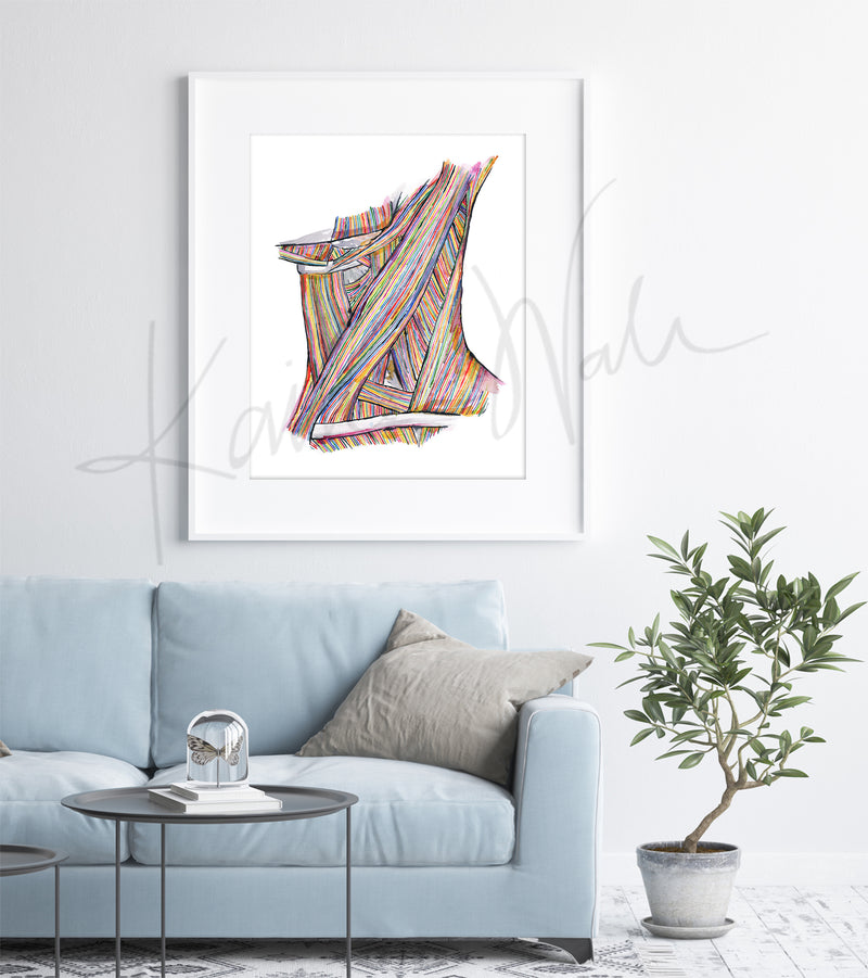 This is a print of a watercolor I painted of the muscles in the neck. This piece was especially fun to paint! I love the beautiful candy stripe effect. The muscles of the neck make important anatomical triangles, which also make for a fun and playful line drawing.