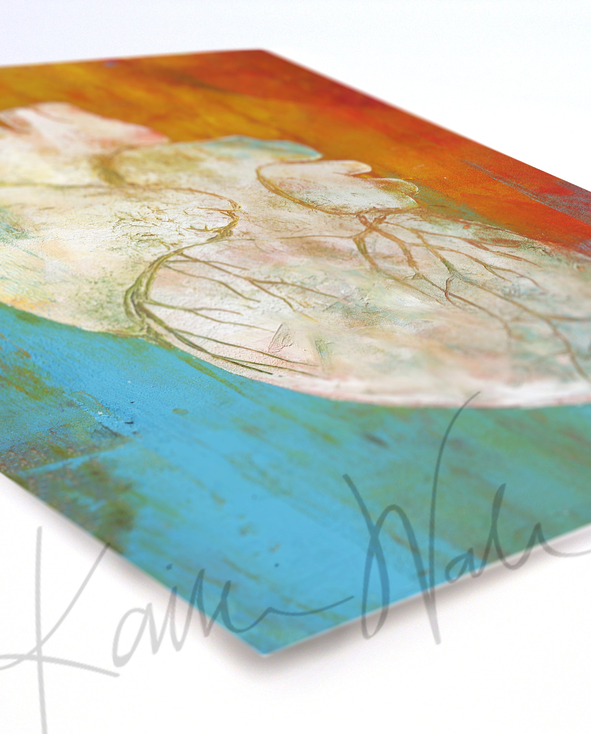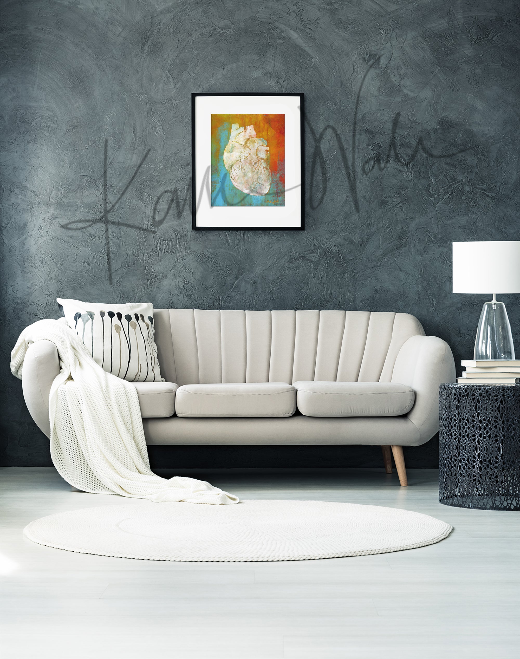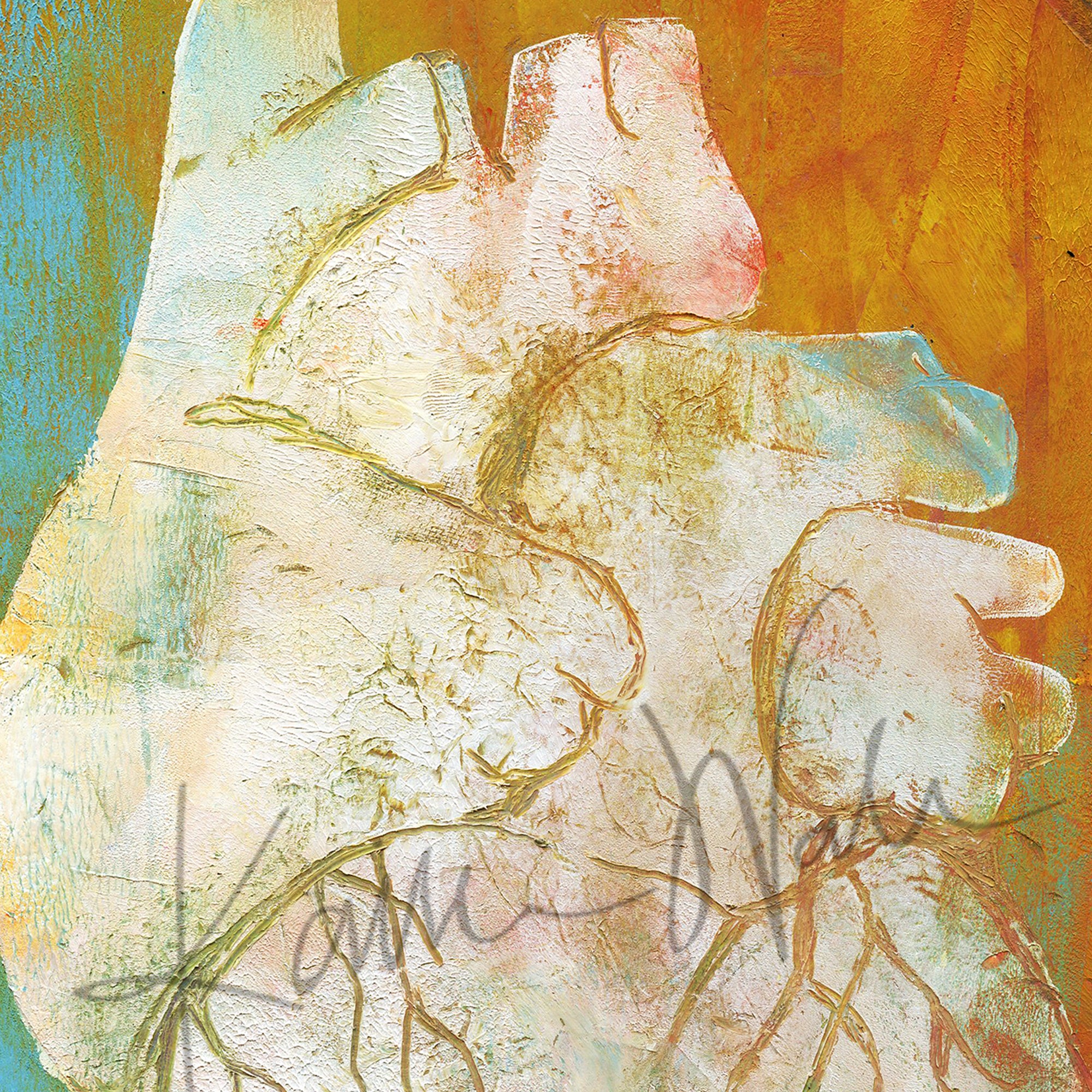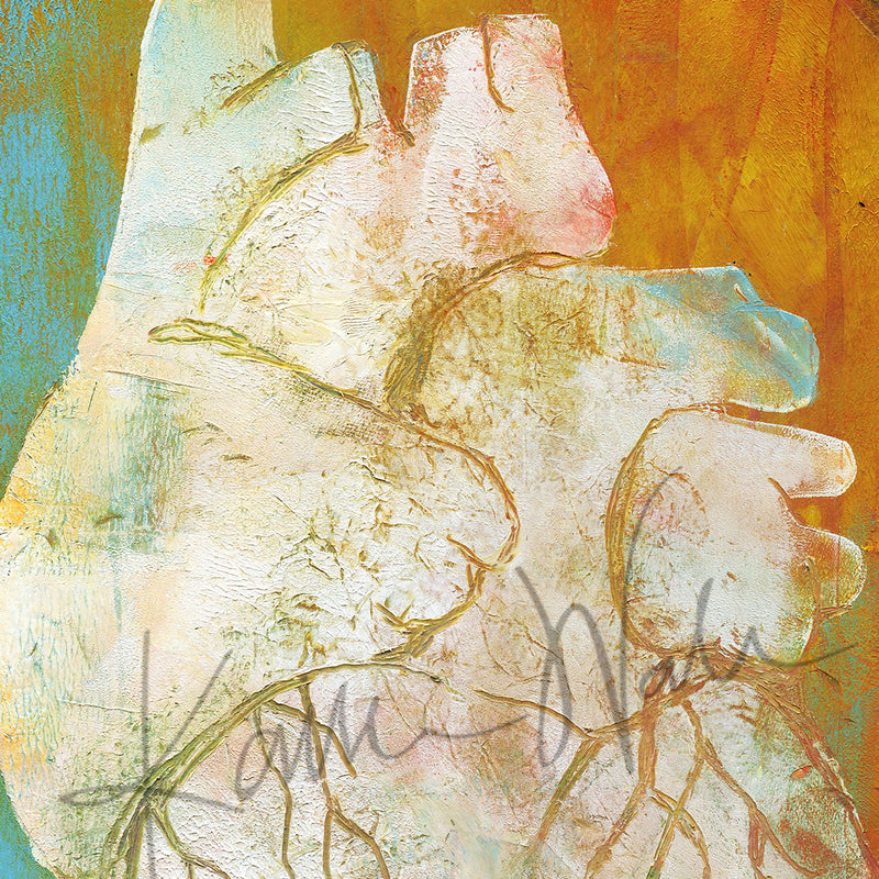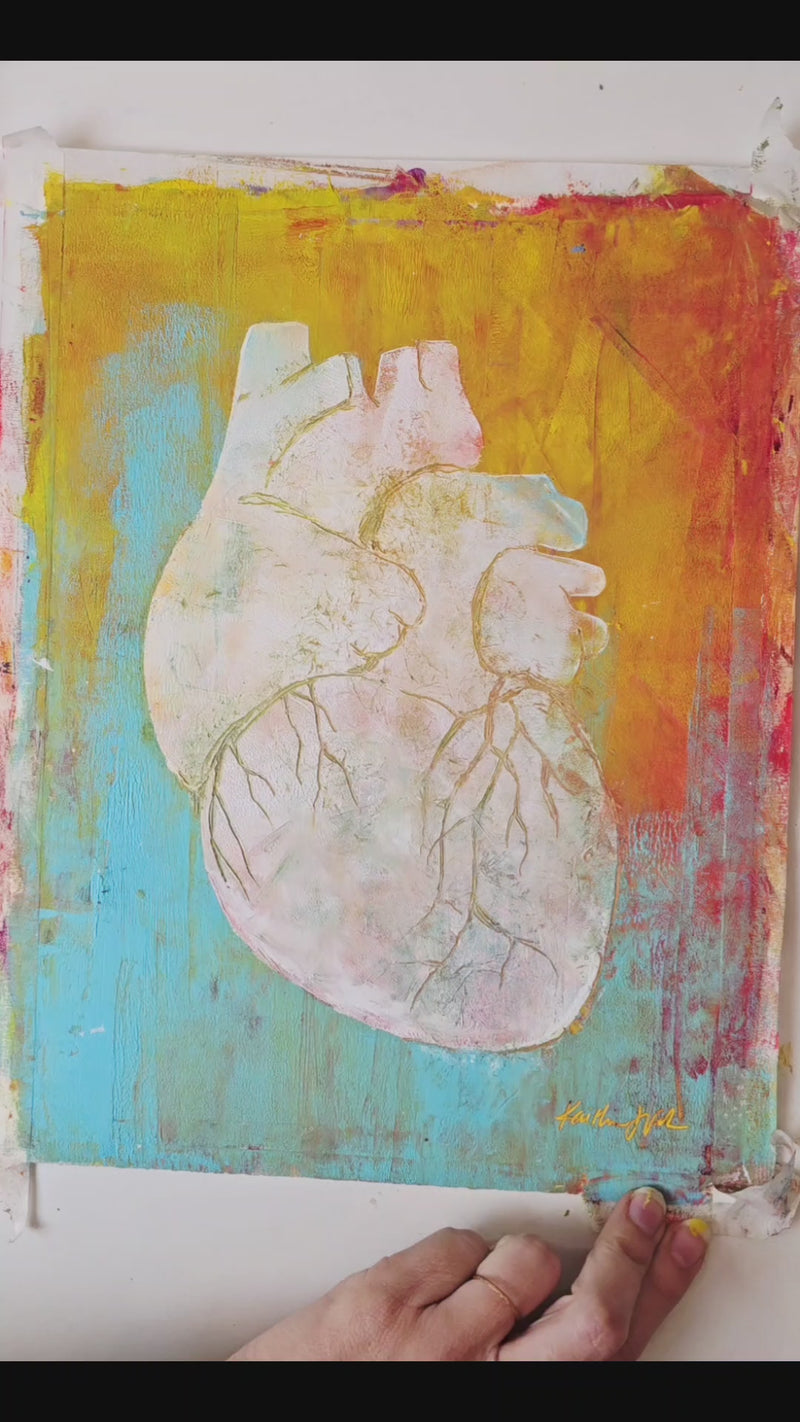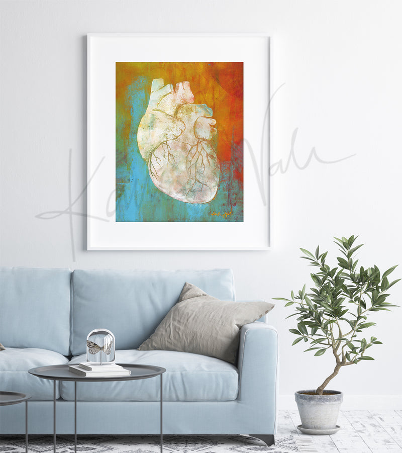 This is a print of an original piece of the heart I made with cold wax and oil paint. This piece was especially fun, as I created the background, and then stenciled the heart outline before I etched in the vasculature and inner art.