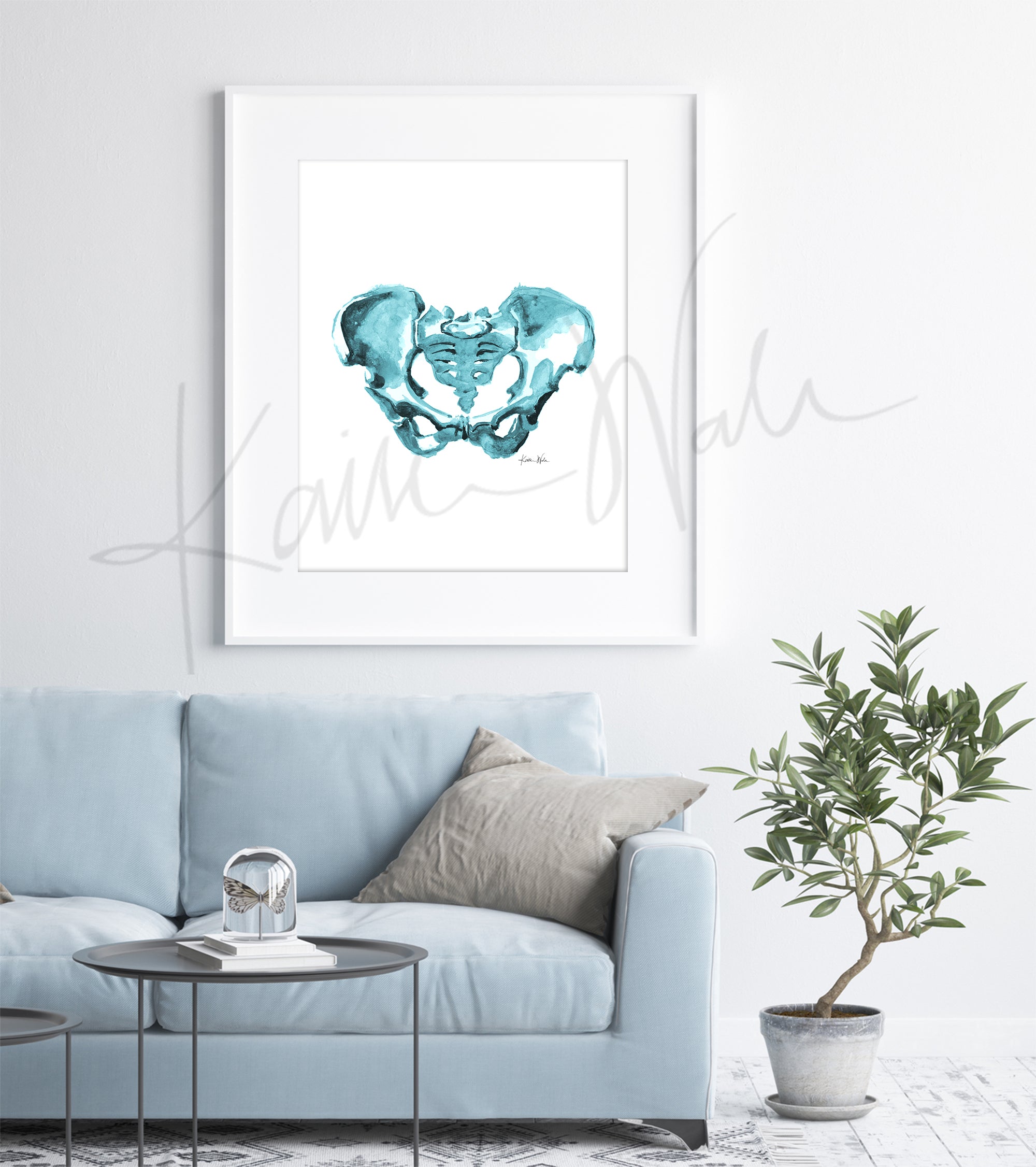 This is a print of my original watercolor painting I made. It depicts the female pelvis, using a cool blue color palette.