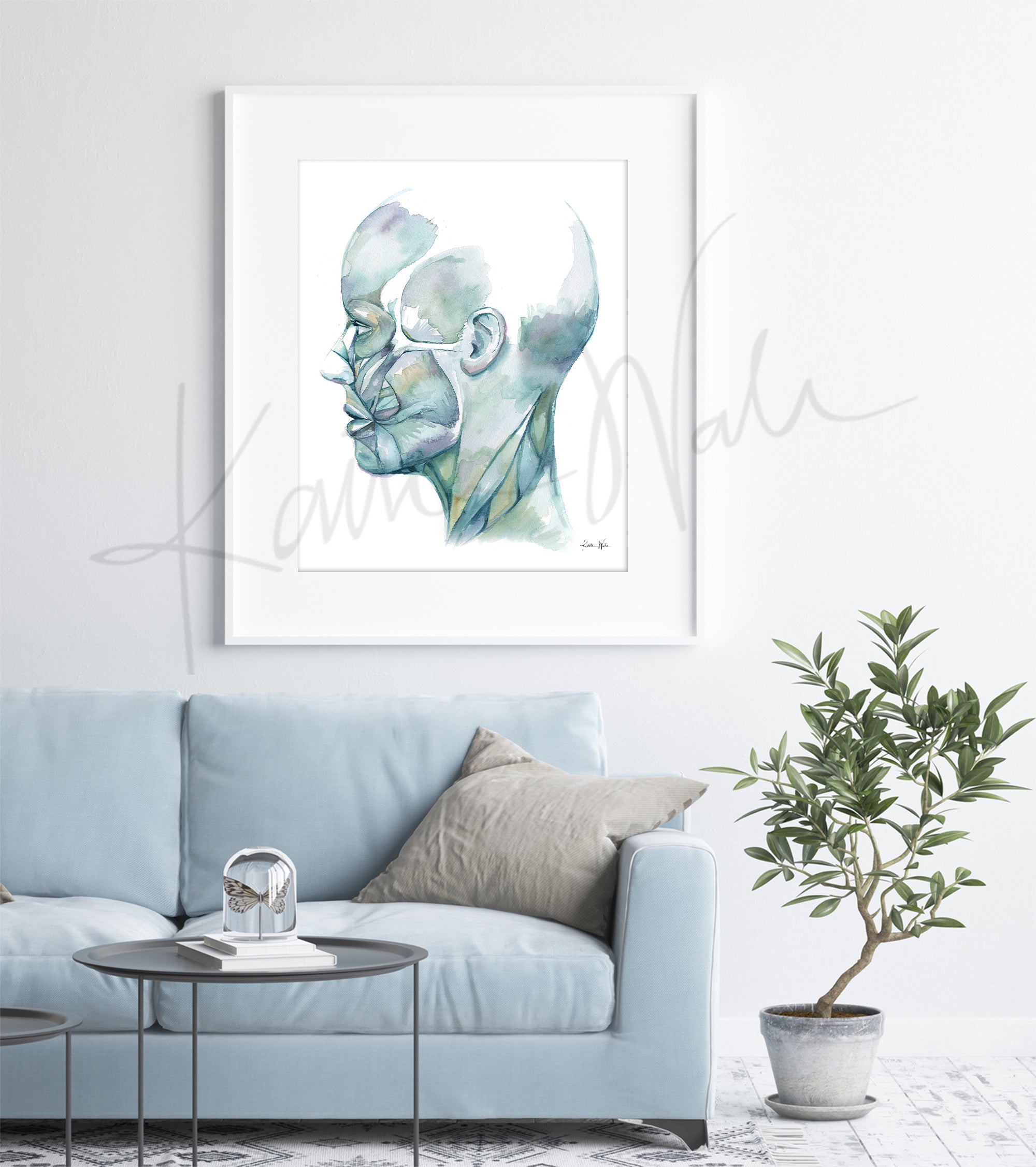 This is a print of a watercolor I made of the muscles of facial expression. The pastel colors and soft approach make this depiction of the muscles of the face gentle and serene. This print would make a wonderful gift for any ENT, aesthetician, massage therapist, or anatomy enthusiast!