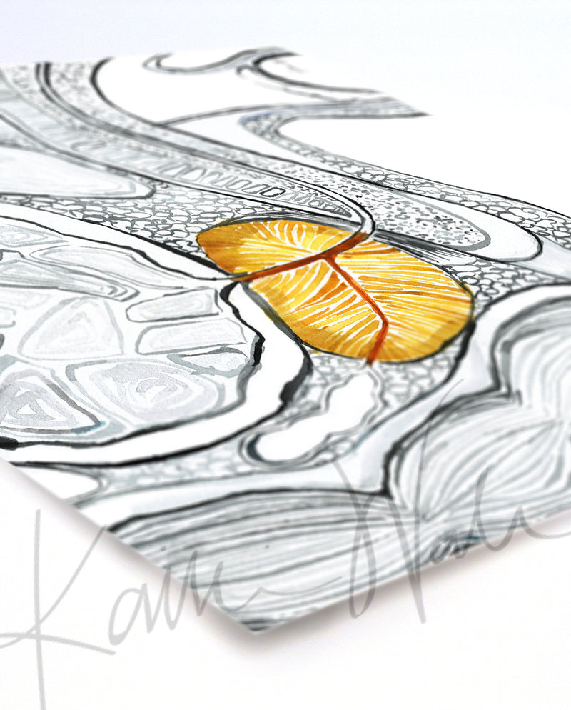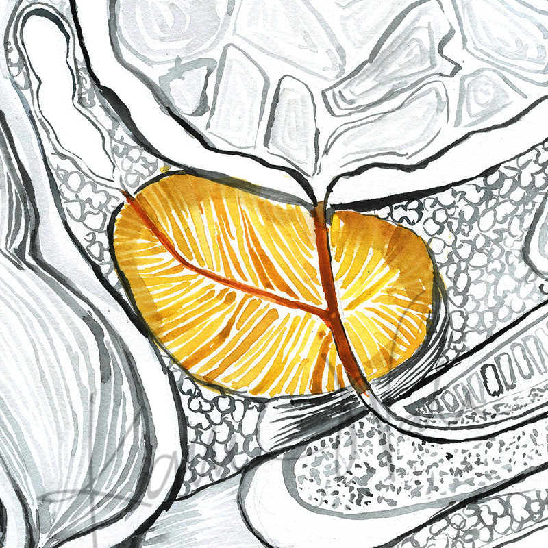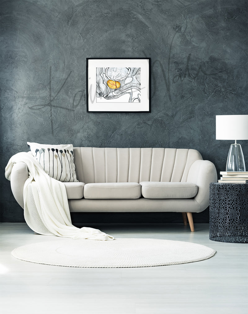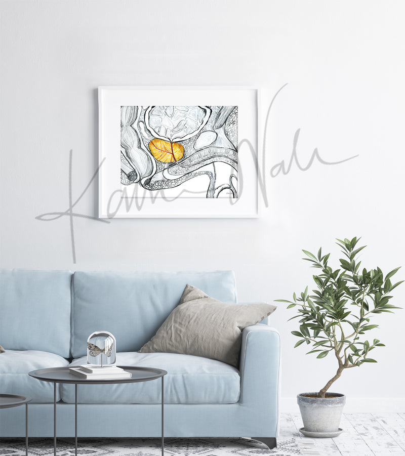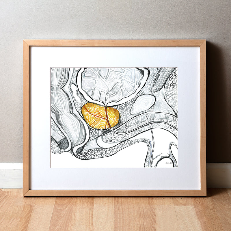 This is a print of a painting of the Prostate. I loved doing a stylistic approach with watercolor and making it pop with gold and orange.