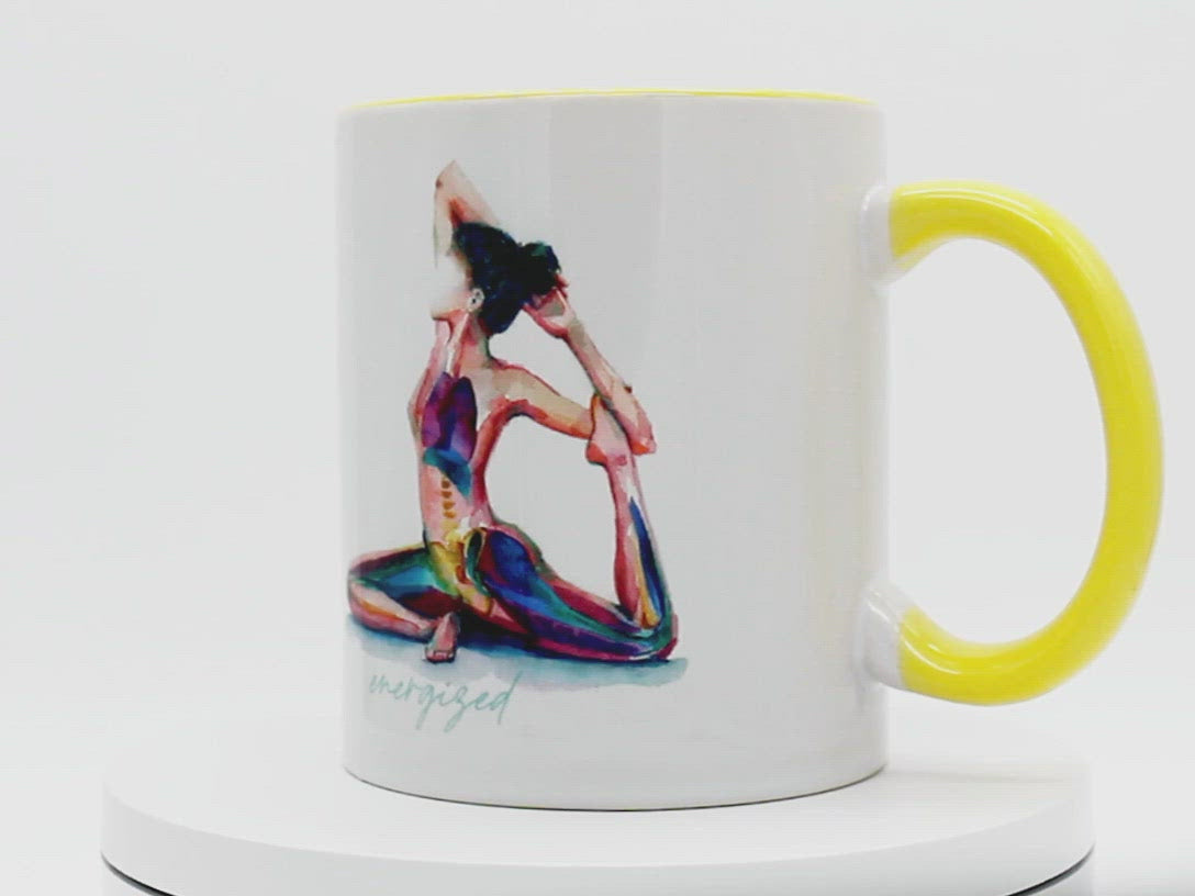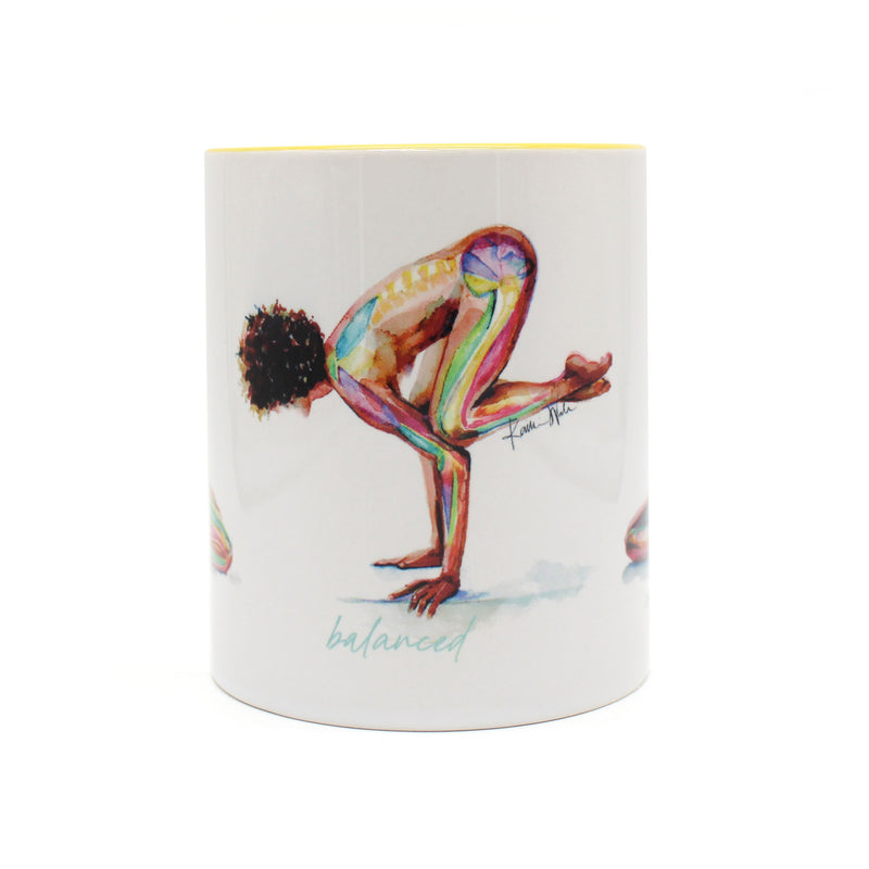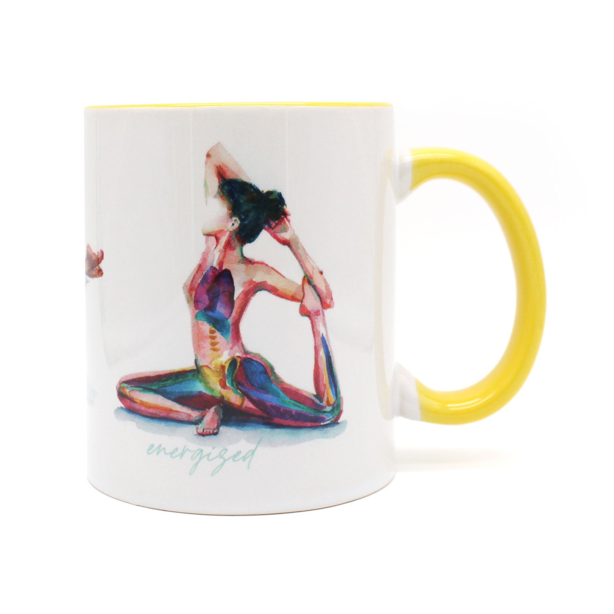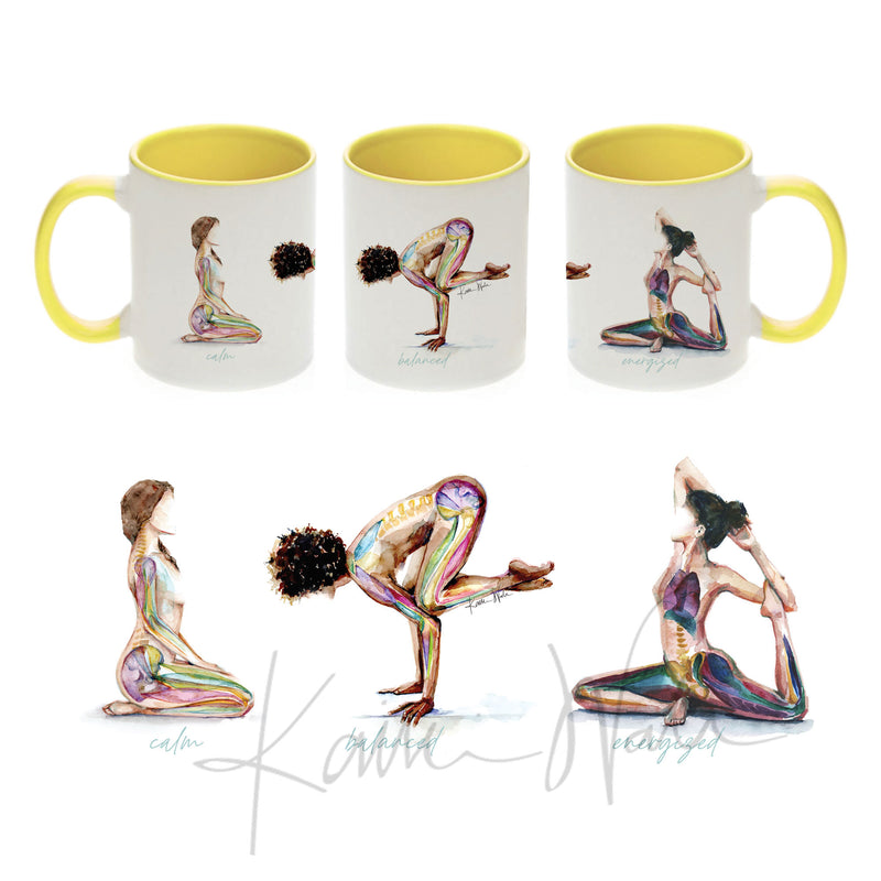 This beautiful anatomy mug shows 3 different seated yoga poses in subtle yet bold color palettes. In each painting, I tried to emphasize the importance of deep, diaphragmatic breathing by including lung and diaphragm anatomy. I also painted the superficial leg muscles, since this is where I always feel the strong stretch in these poses. I love the contrast of the bold colors with the yellow of the mug.