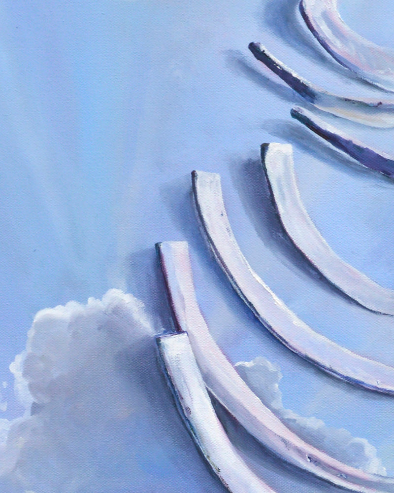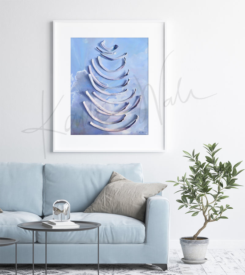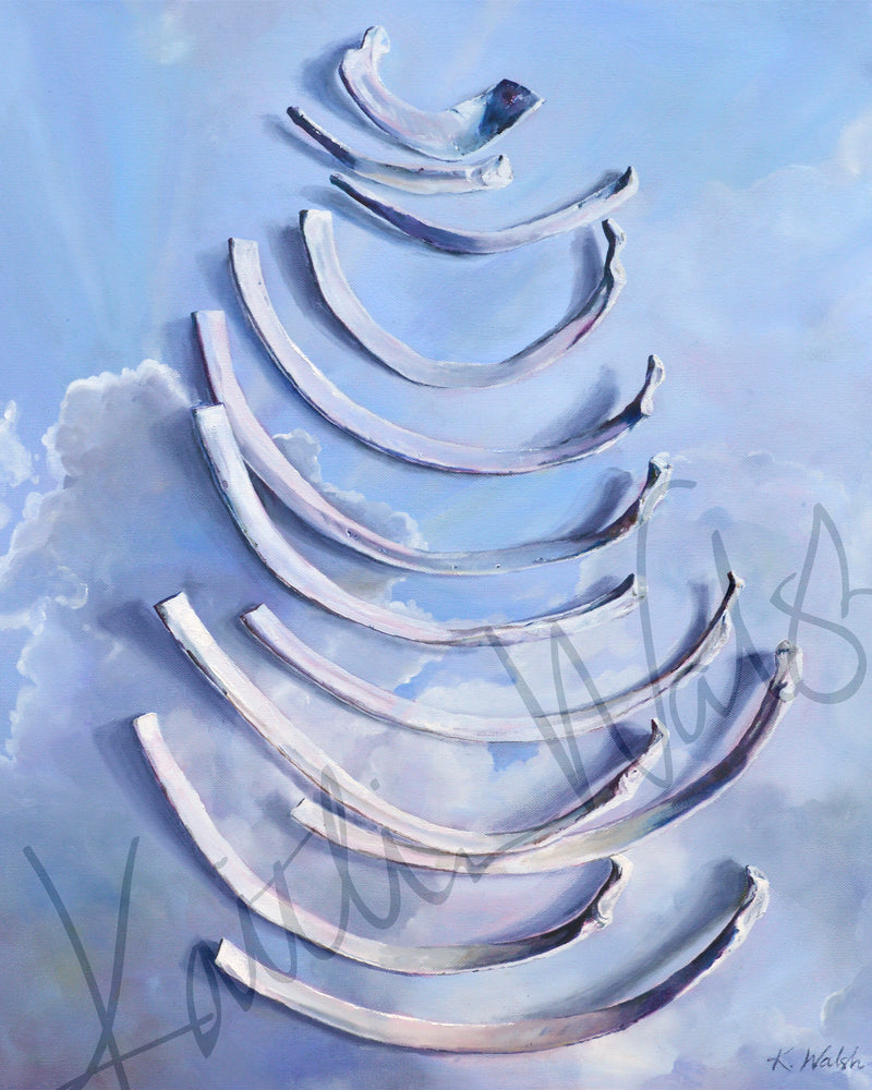 This item is a print of an original oil painting that I made of the disarticulated rib bones on a field of blue sky with the sun peaking behind the clouds. I call it "Uncaged". To me, it showcases that untethered feeling you get when you take the deepest of breaths. Bound in a world weighted by responsibilities, I dream of a mental freedom that is unattainable, at least in this stage of life. But outside in fresh air, with a soulful breath so deep I feel my ribs strain, I feel a wisp of that boundless unburdening and am refreshed just enough.