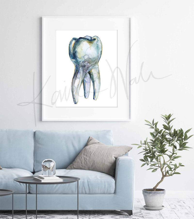 This is a print I made of a 3-root maxillary molar. I love the pops of color that peek through the neutral palette.