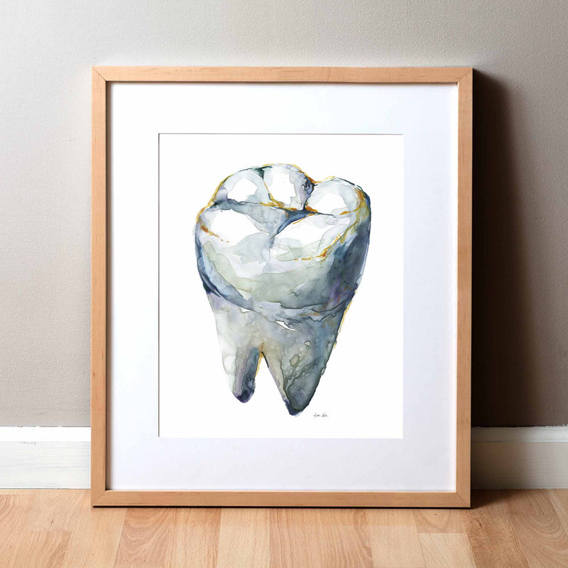 This is a print I made of a mandibular molar. The angled view allows you to see both the roots and the occlusal surface! I love the pops of color that peek through the neutral palette.